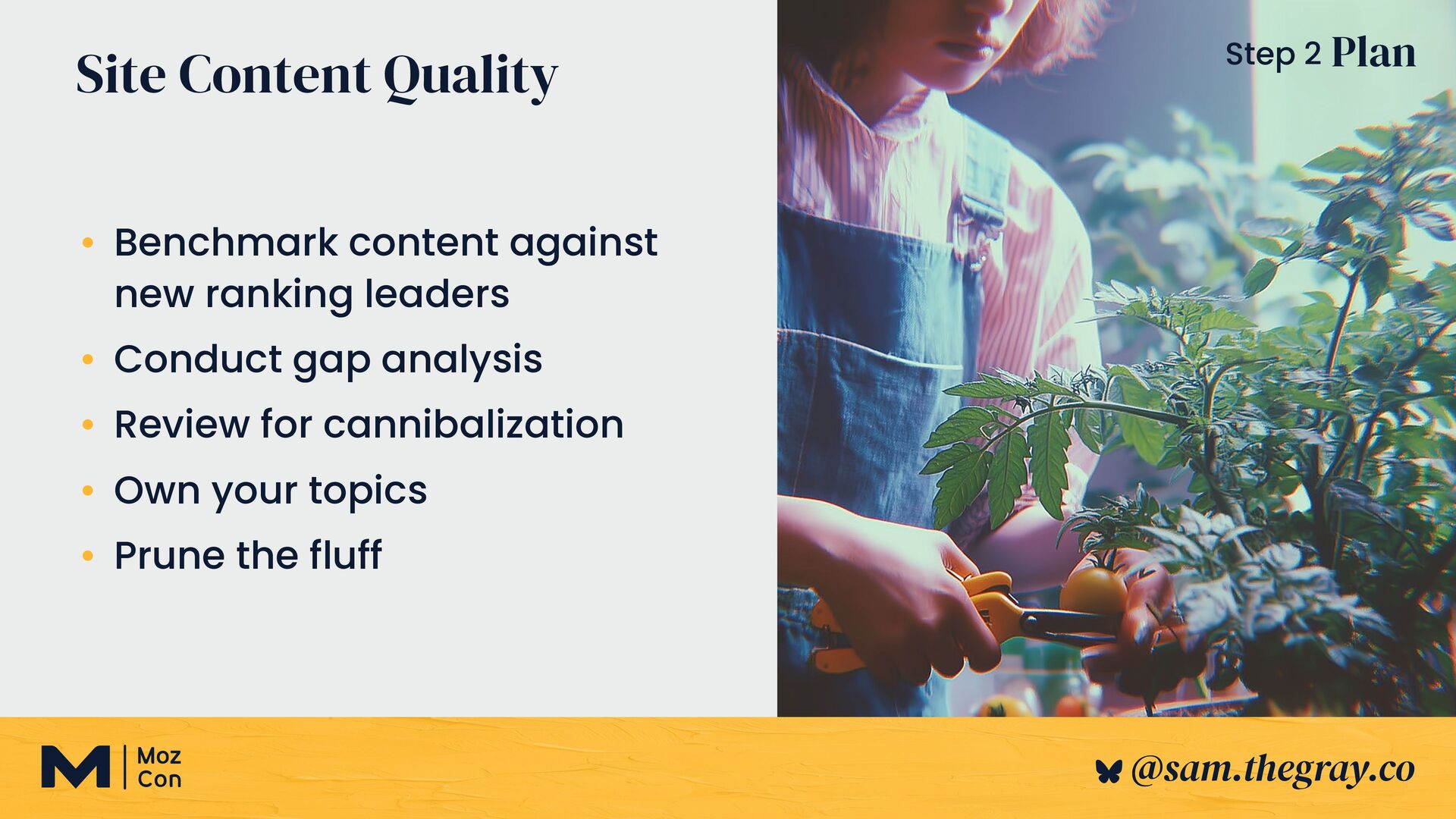 analysis • Review for cannibalization • Own your topics • Prune the fluff Site Content Quality Plan Step 2