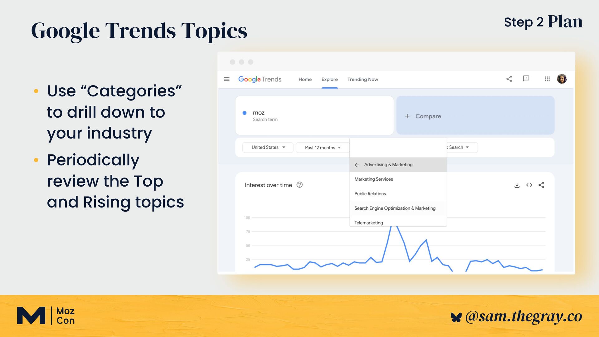 17. Google Trends Topics Plan Step 2 • Use “Categories” to