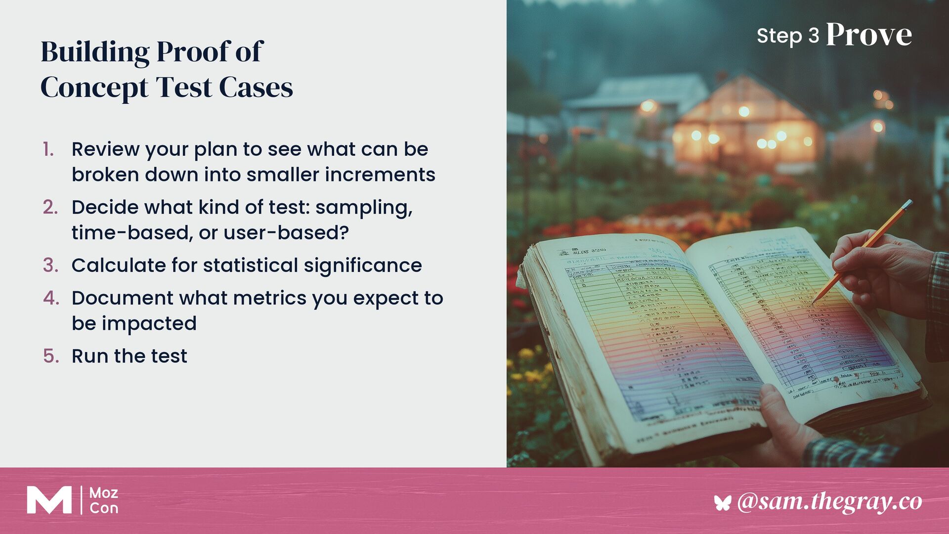 to see what can be broken down into smaller increments 2. Decide what kind of test: sampling, time-based, or user-based? 3. Calculate for statistical significance 4. Document what metrics you expect to be impacted 5. Run the test Prove Step 3
