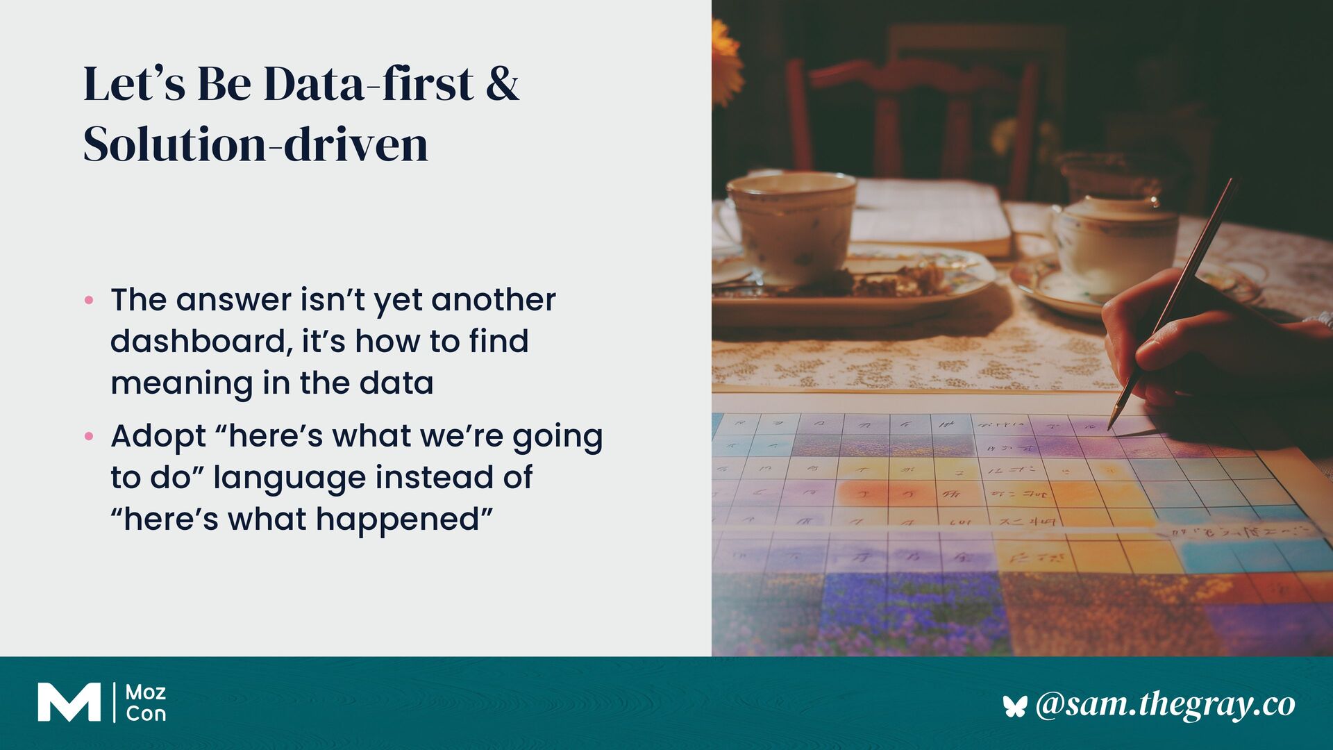 another dashboard, it’s how to find meaning in the data • Adopt “here’s what we’re going to do” language instead of “here’s what happened”