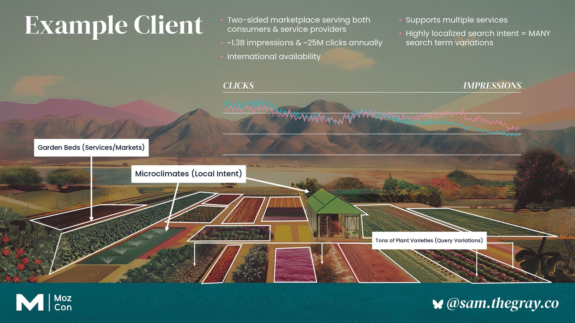 ~1.3B impressions & ~25M clicks annually • International availability • Supports multiple services • Highly localized search intent = MANY search term variations Example Client Tons of Plant Varieties (Query Variations) Microclimates (Local Intent) Garden Beds (Services/Markets)