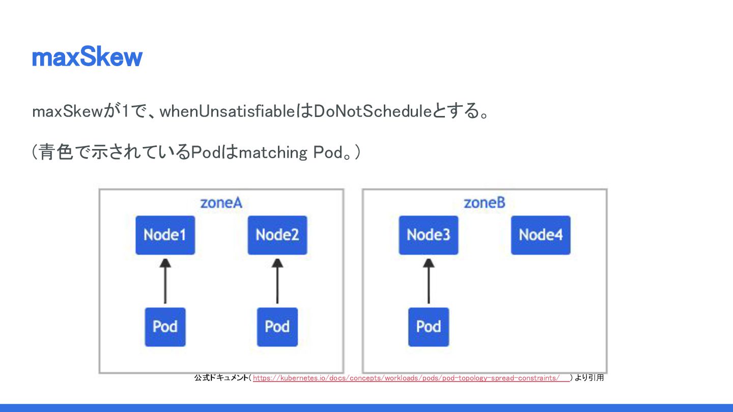 maxSkew maxSkewが1で、whenUnsatisfiableはDoNotScheduleとする。 (青色で示されているPodはmatching Pod。) 公式ドキュメント( https://kubernetes.io/docs/concepts/workloads/pods/pod-topology-spread-constraints/ ) より引用