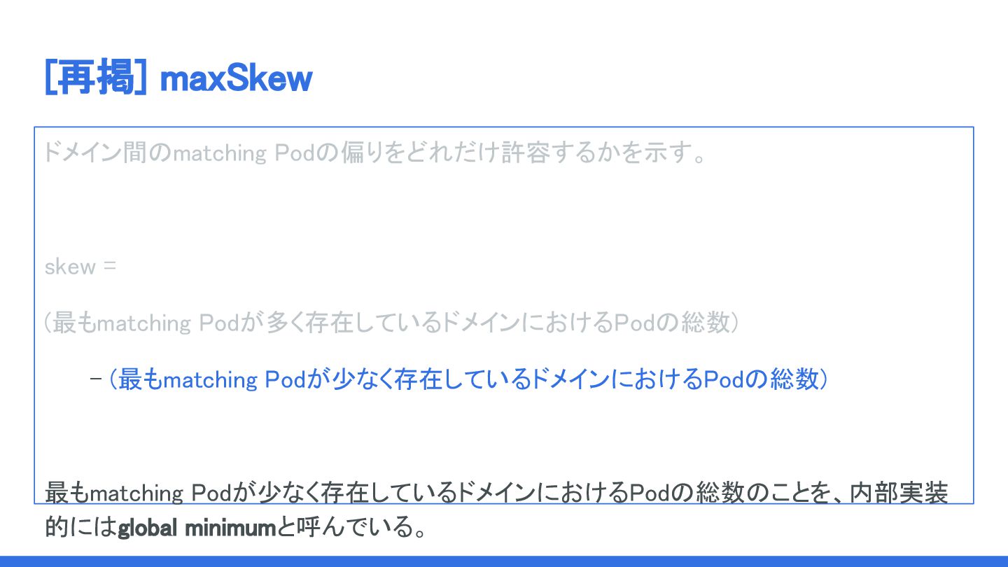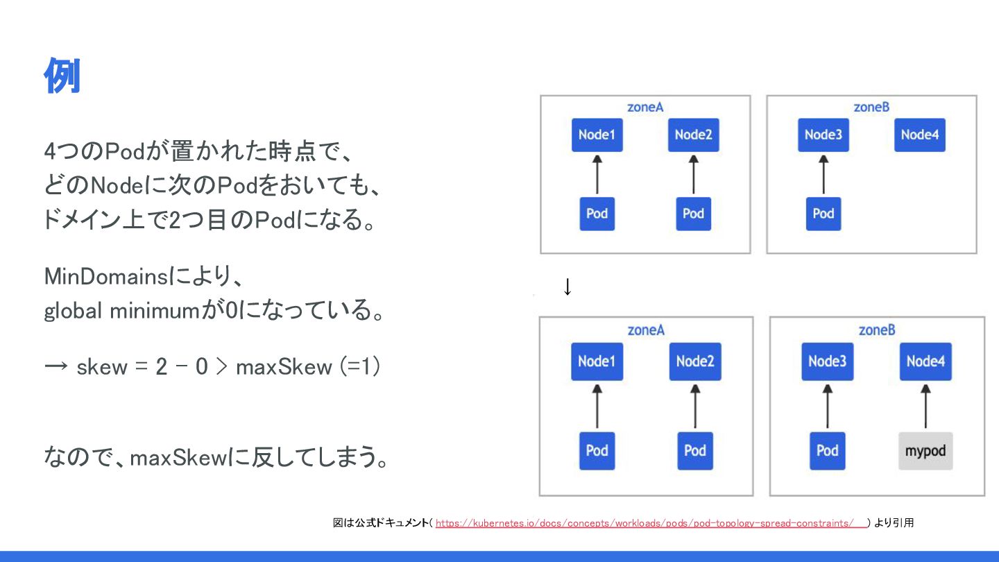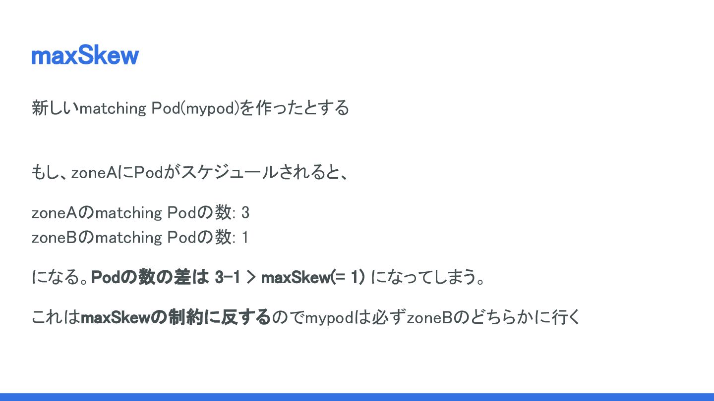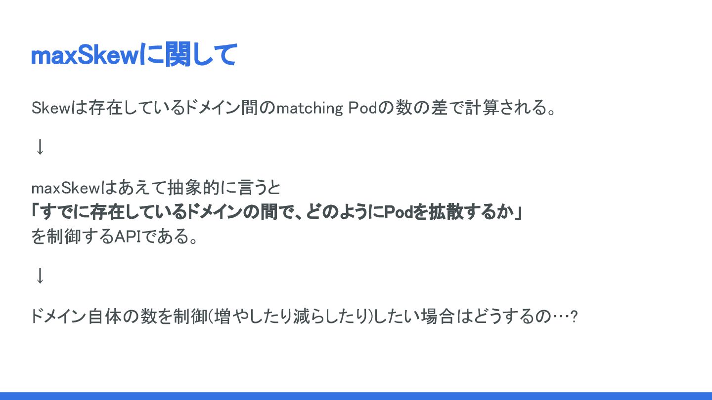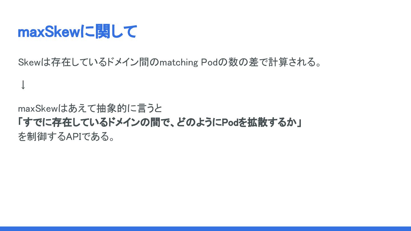 maxSkewに関して Skewは存在しているドメイン間のmatching Podの数の差で計算される。 ↓ maxSkewはあえて抽象的に言うと 「すでに存在しているドメインの間で、どのようにPodを拡散するか」 を制御するAPIである。