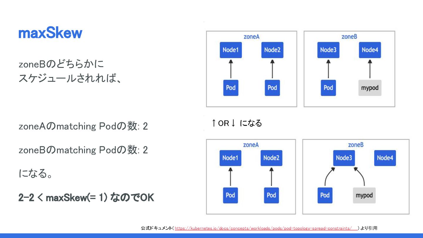 になる。 2-2 < maxSkew(= 1) なのでOK ↑OR↓ になる 公式ドキュメント( https://kubernetes.io/docs/concepts/workloads/pods/pod-topology-spread-constraints/ ) より引用