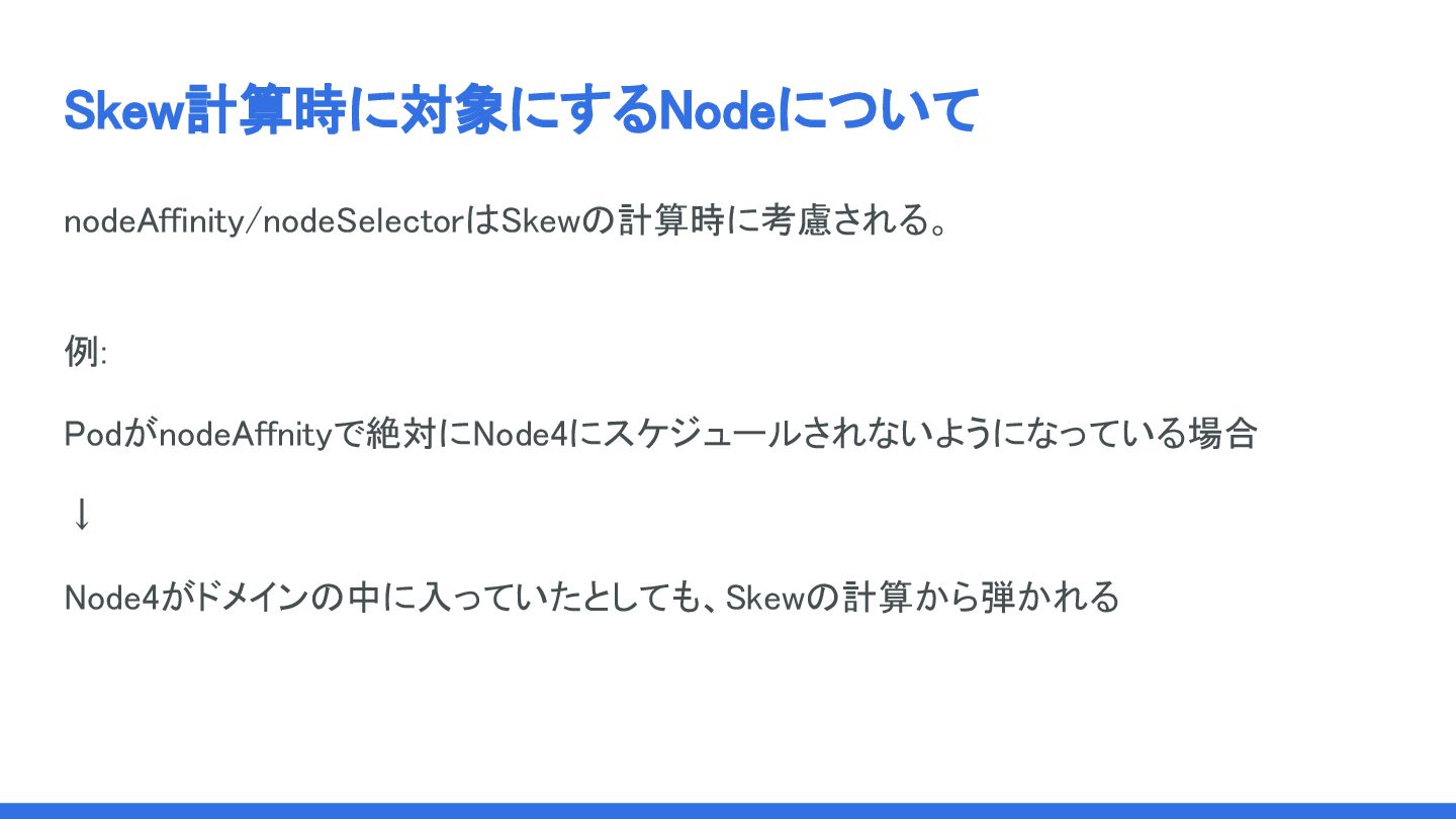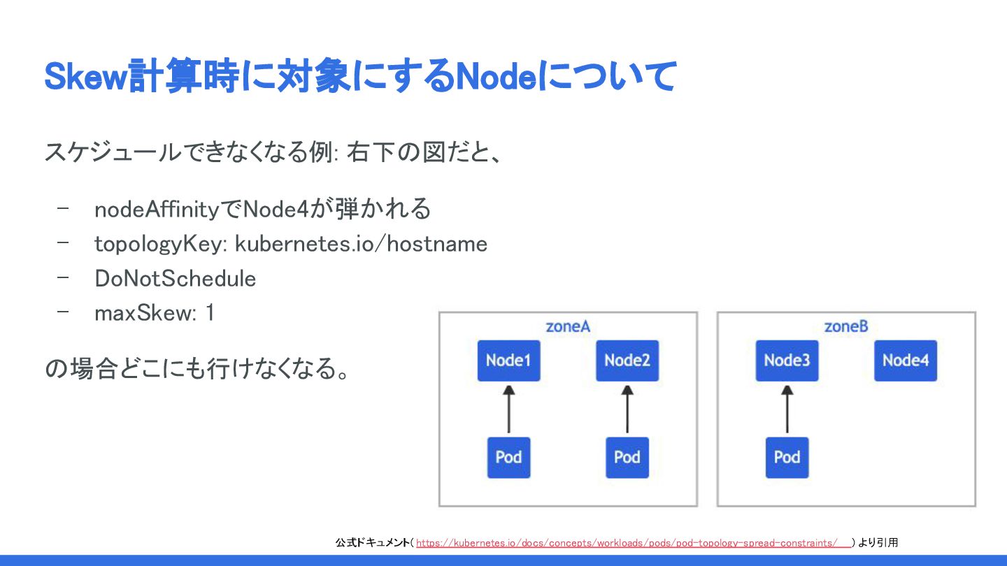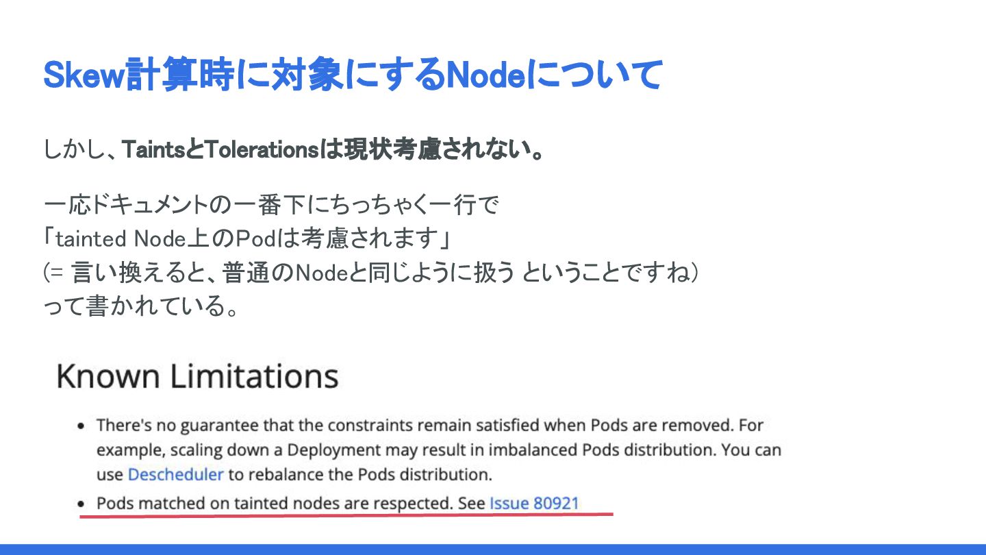 Skew計算時に対象にするNodeについて しかし、TaintsとTolerationsは現状考慮されない。 一応ドキュメントの一番下にちっちゃく一行で 「tainted Node上のPodは考慮されます」 (= 言い換えると、普通のNodeと同じように扱う ということですね) って書かれている。