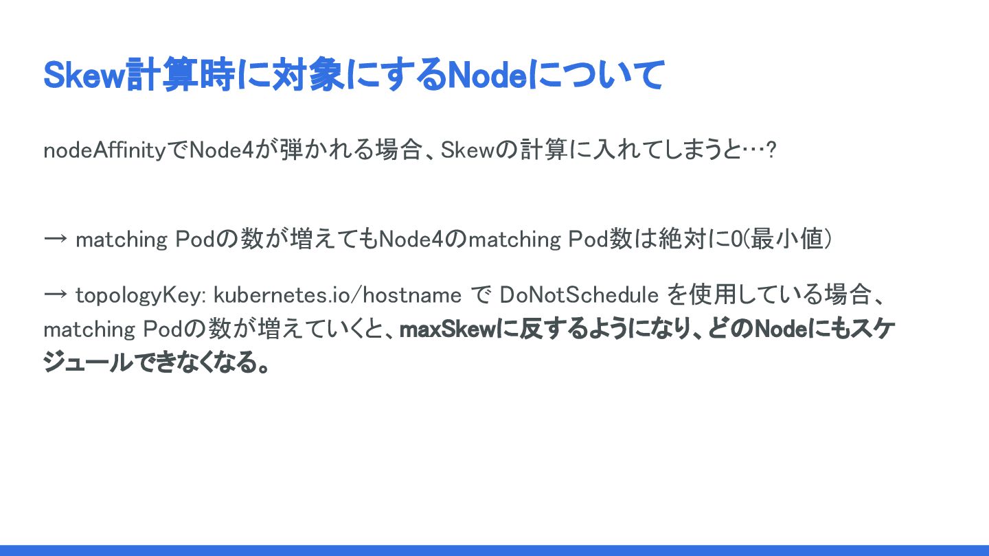 Skew計算時に対象にするNodeについて nodeAffinityでNode4が弾かれる場合、Skewの計算に入れてしまうと…? → matching Podの数が増えてもNode4のmatching Pod数は絶対に0(最小値) → topologyKey: kubernetes.io/hostname