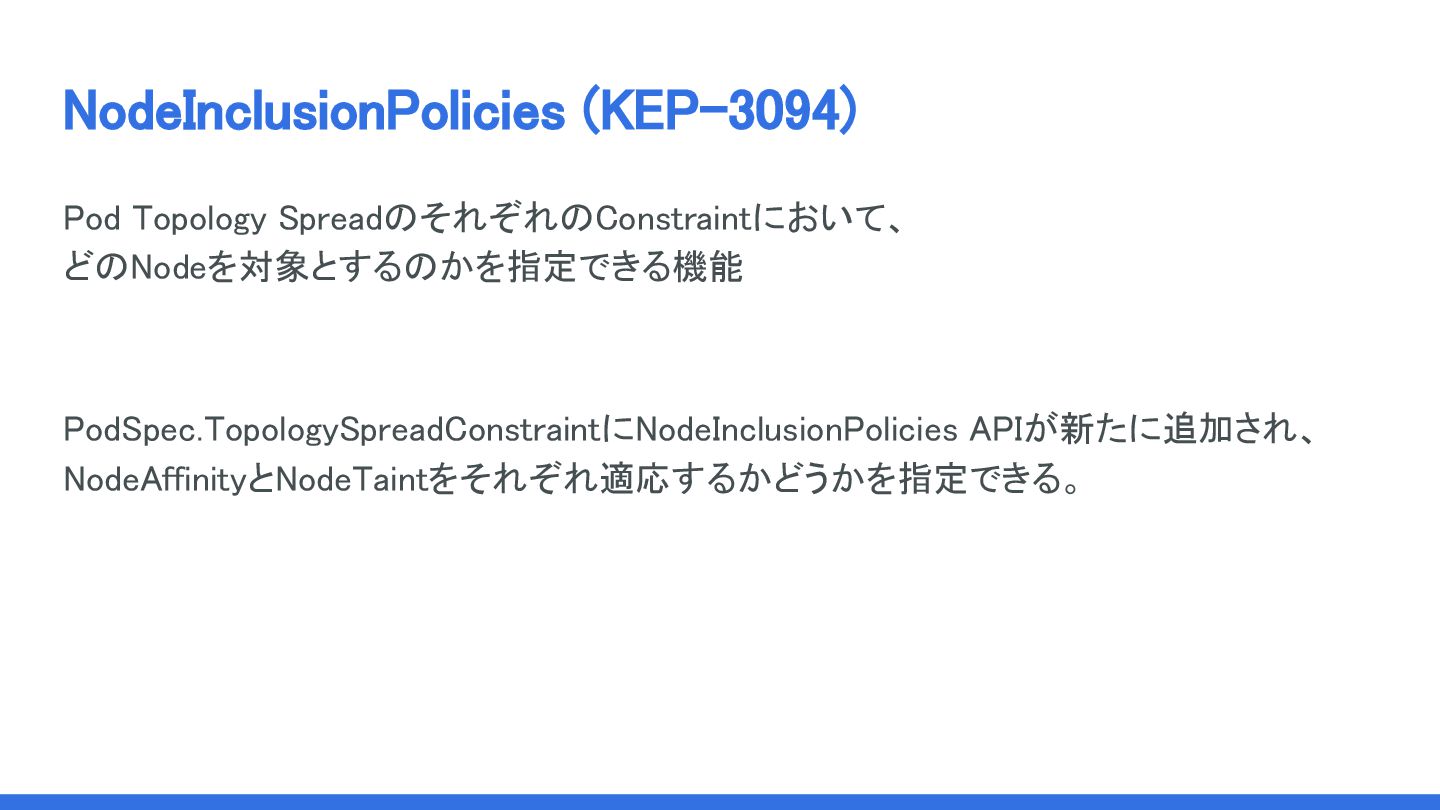 NodeInclusionPolicies (KEP-3094) Pod Topology SpreadのそれぞれのConstraintにおいて、 どのNodeを対象とするのかを指定できる機能 PodSpec.TopologySpreadConstraintにNodeInclusionPolicies APIが新たに追加され、
