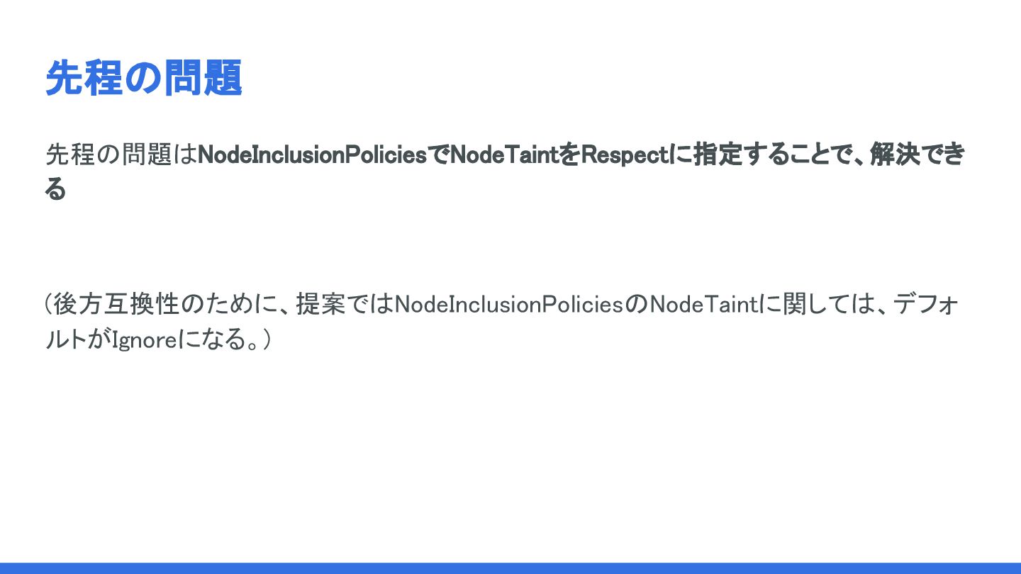 先程の問題 先程の問題はNodeInclusionPoliciesでNodeTaintをRespectに指定することで、解決でき る (後方互換性のために、提案ではNodeInclusionPoliciesのNodeTaintに関しては、デフォ ルトがIgnoreになる。)
