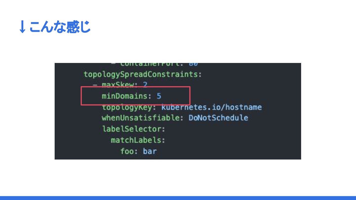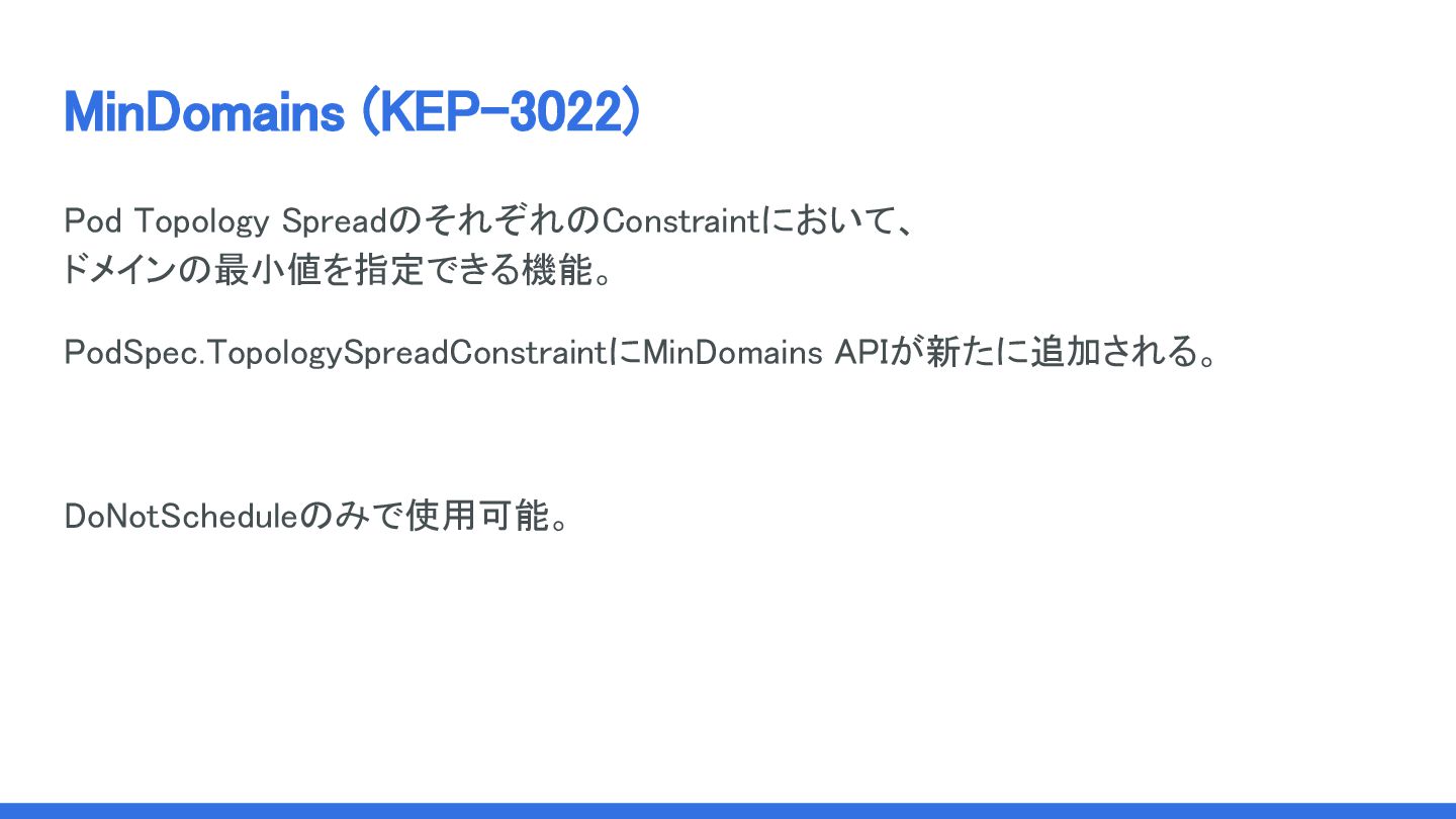 MinDomains (KEP-3022) Pod Topology SpreadのそれぞれのConstraintにおいて、 ドメインの最小値を指定できる機能。 PodSpec.TopologySpreadConstraintにMinDomains APIが新たに追加される。 DoNotScheduleのみで使用可能。