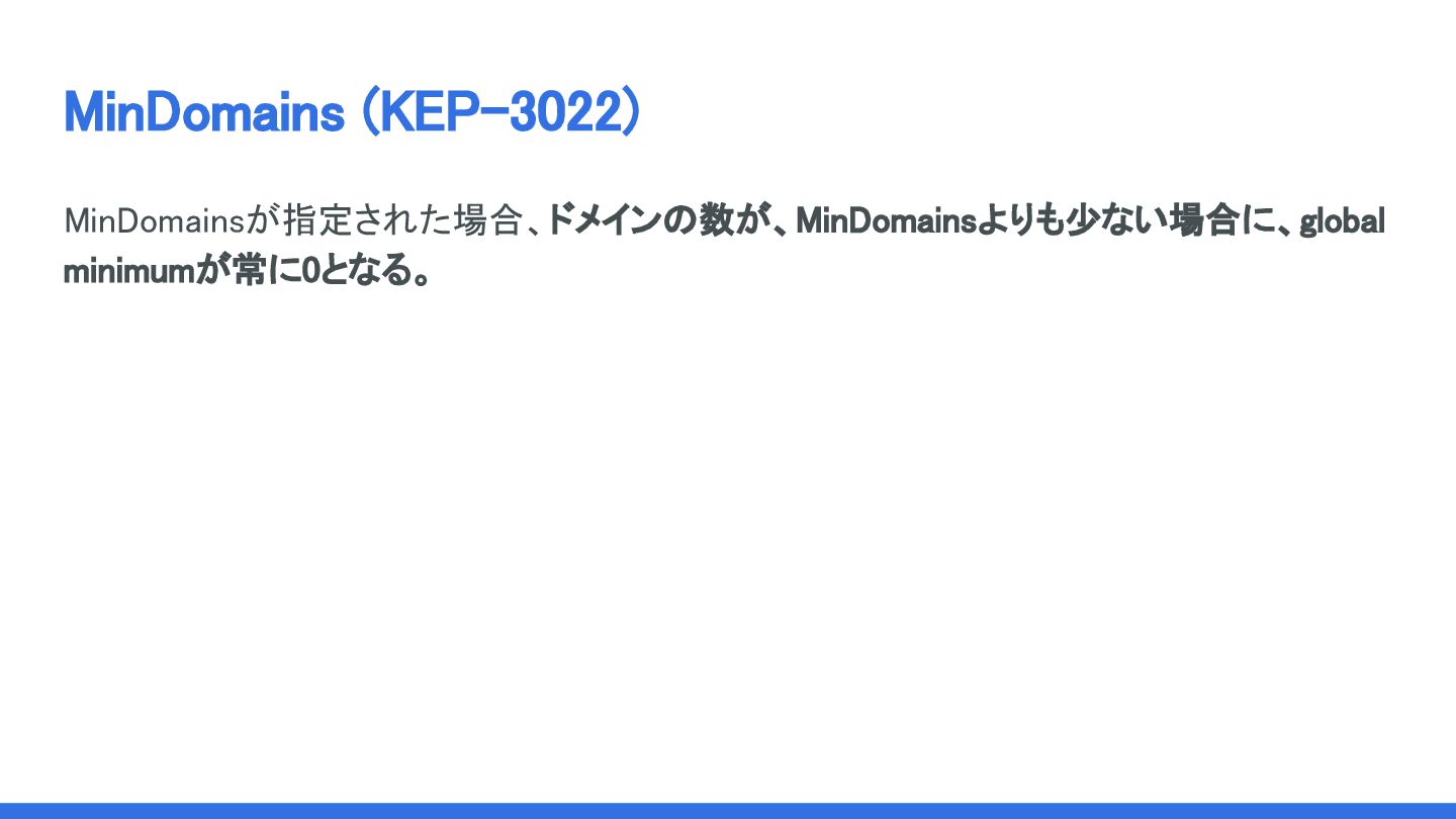 MinDomains (KEP-3022) MinDomainsが指定された場合、ドメインの数が、MinDomainsよりも少ない場合に、global minimumが常に0となる。