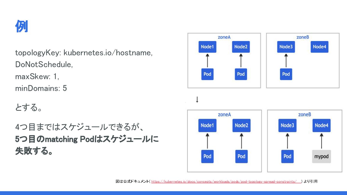 5 とする。 4つ目まではスケジュールできるが、 5つ目のmatching Podはスケジュールに 失敗する。 図は公式ドキュメント( https://kubernetes.io/docs/concepts/workloads/pods/pod-topology-spread-constraints/ ) より引用 ↓