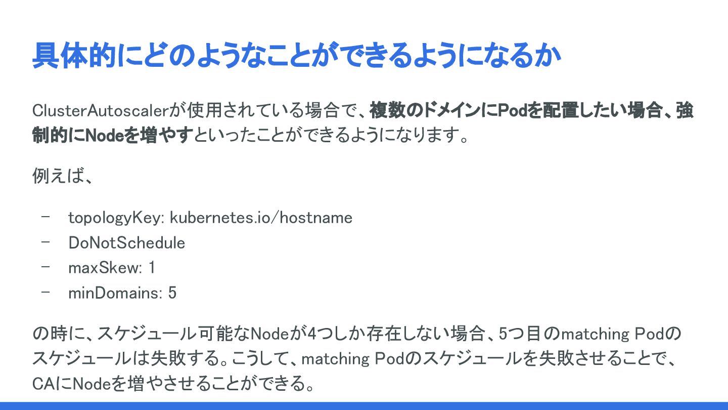具体的にどのようなことができるようになるか ClusterAutoscalerが使用されている場合で、複数のドメインにPodを配置したい場合、強 制的にNodeを増やすといったことができるようになります。 例えば、 - topologyKey: kubernetes.io/hostname - DoNotSchedule