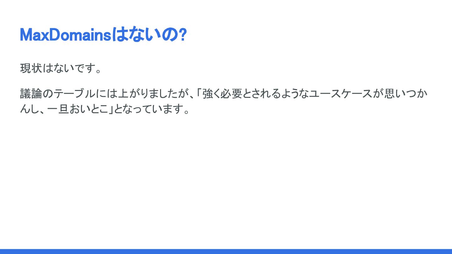 MaxDomainsはないの? 現状はないです。 議論のテーブルには上がりましたが、「強く必要とされるようなユースケースが思いつか んし、一旦おいとこ」となっています。