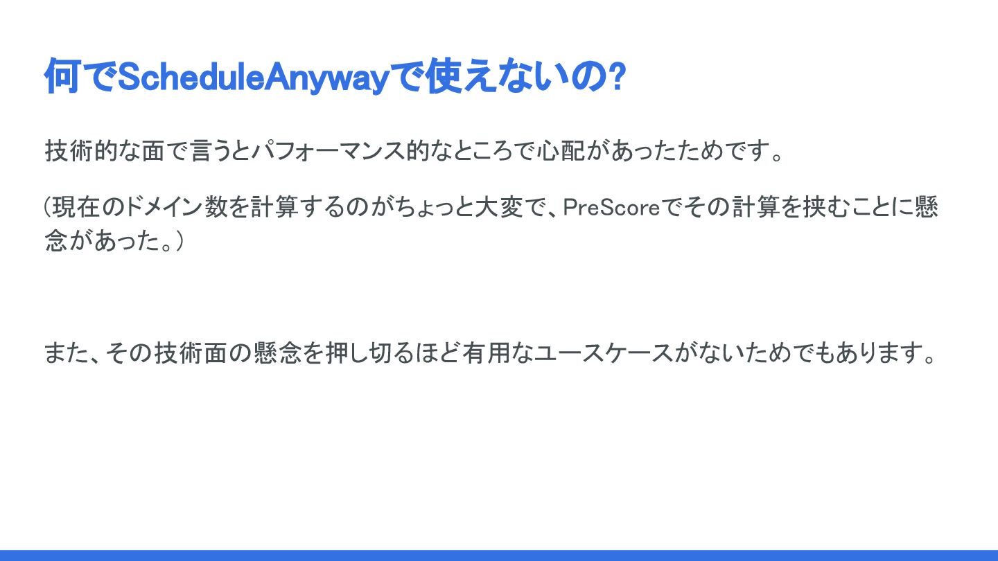 何でScheduleAnywayで使えないの? 技術的な面で言うとパフォーマンス的なところで心配があったためです。 (現在のドメイン数を計算するのがちょっと大変で、PreScoreでその計算を挟むことに懸 念があった。) また、その技術面の懸念を押し切るほど有用なユースケースがないためでもあります。