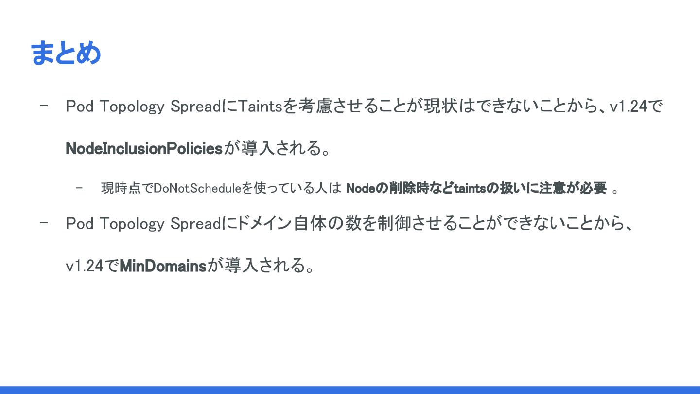まとめ - Pod Topology SpreadにTaintsを考慮させることが現状はできないことから、v1.24で NodeInclusionPoliciesが導入される。 - 現時点でDoNotScheduleを使っている人は Nodeの削除時などtaintsの扱いに注意が必要 。