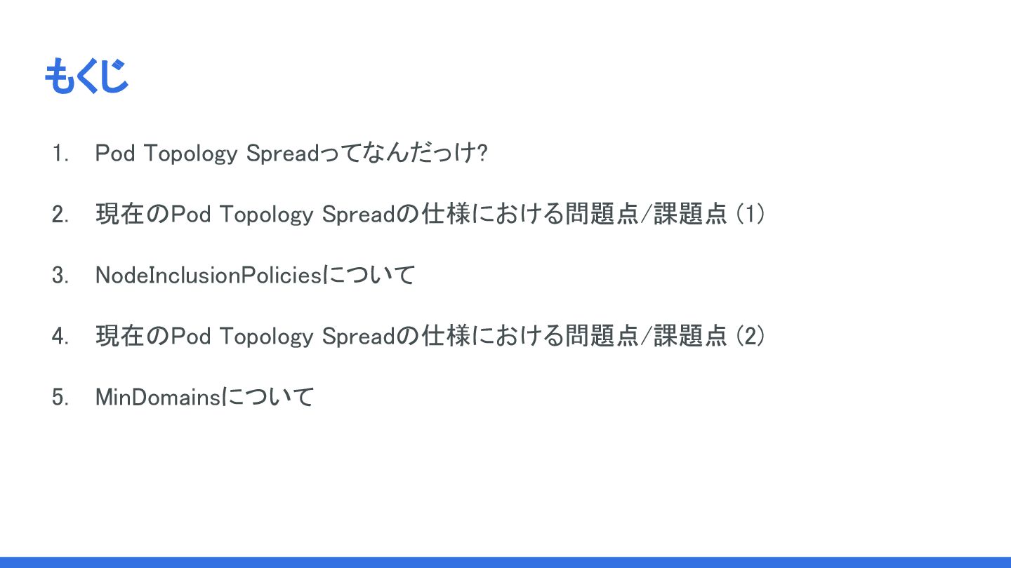 3. NodeInclusionPoliciesについて 4. 現在のPod Topology Spreadの仕様における問題点/課題点 (2) 5. MinDomainsについて