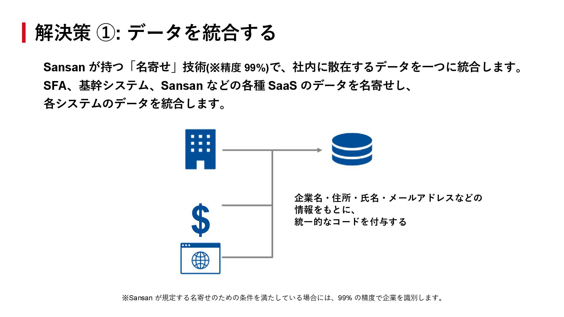データを統合する ※Sansan が規定する名寄せのための条件を満たしている場合には、99% の精度で企業を識別します。 企業名・住所・氏名・メールアドレスなどの 情報をもとに、 統一的なコードを付与する $