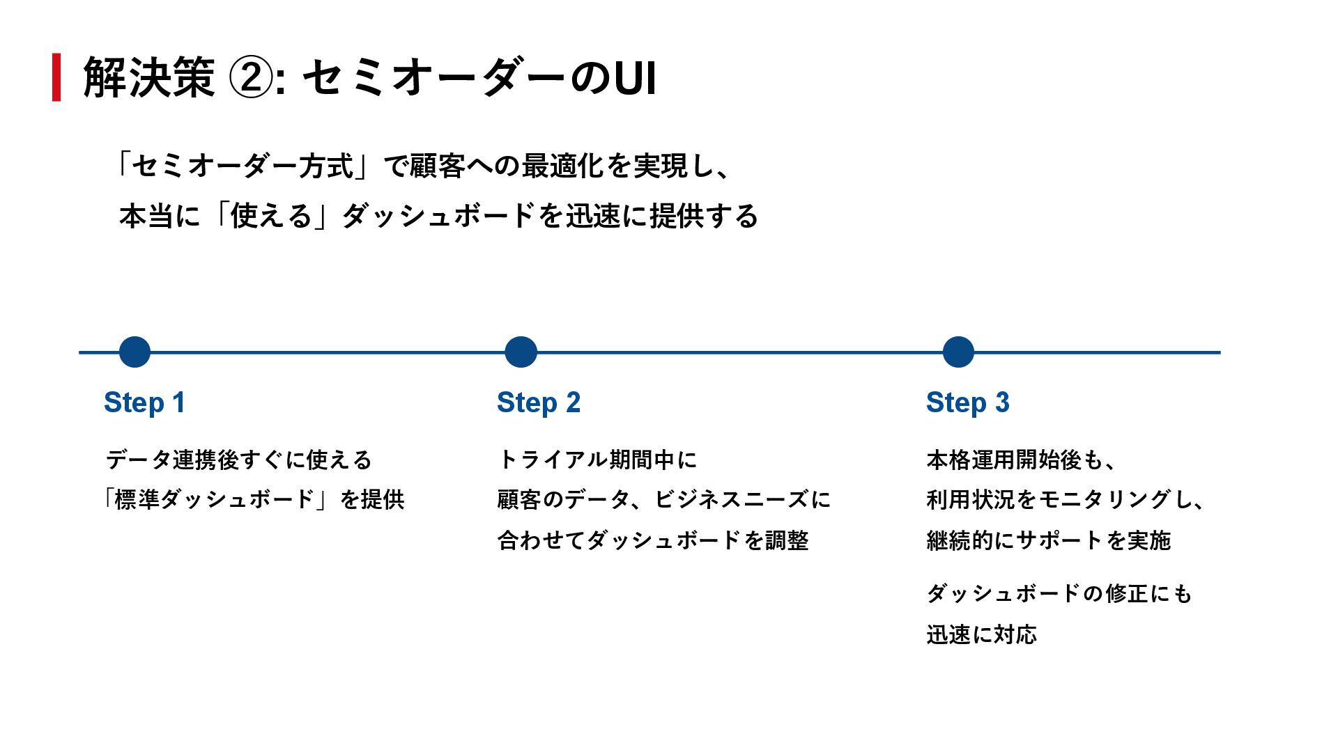 Insights」を発展させ、 ダッシュボードでの分析体験をベースにしつつ、 ダッシュボードにとどまらず、AI自体が自律的に分析・ 示唆出しを実施 = AI on BI から AI with BI への進化 伴走型の導入支援 解決策 ②「セミオーダー方式」の実現のための • ビジネス・開発が一体となったサポート体制 • 段階的な導入プロセス • 継続的な改善の仕組み