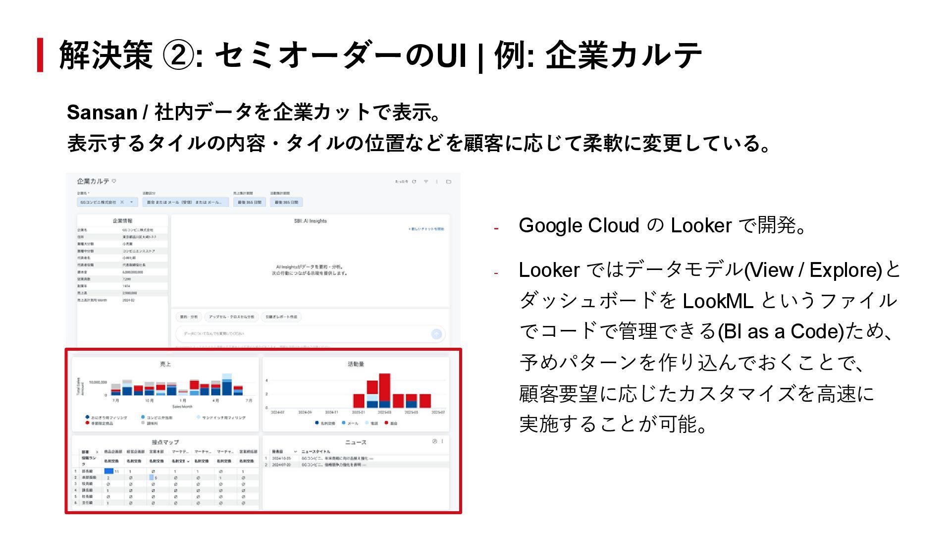 - Google Cloud の Looker で開発。 - Looker ではデータモデル(View / Explore)と ダッシュボードを LookML というファイル でコードで管理できる(BI as a Code)ため、 予めパターンを作り込んでおくことで、 顧客要望に応じたカスタマイズを高速に 実施することが可能。