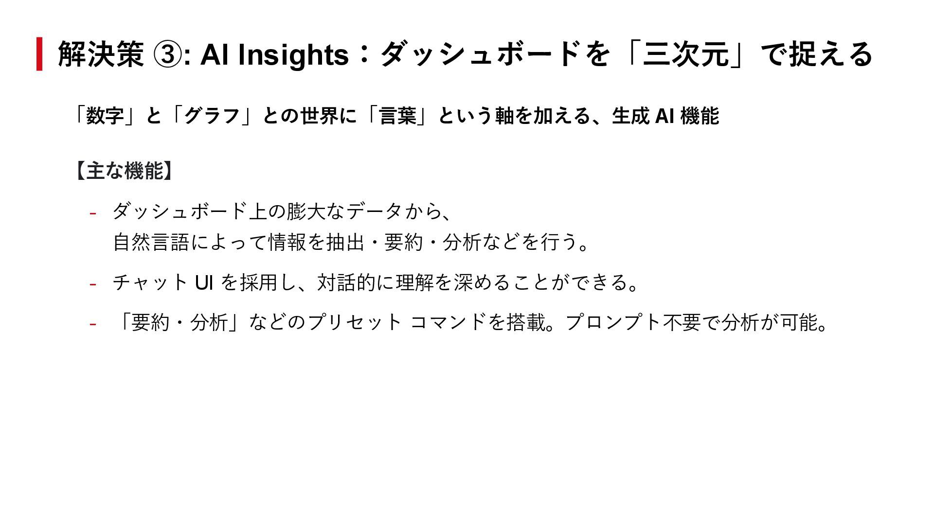 を採用し、対話的に理解を深めることができる。 - 「要約・分析」などのプリセット コマンドを搭載。プロンプト不要で分析が可能。 解決策 ③: AI Insights:ダッシュボードを「三次元」で捉える