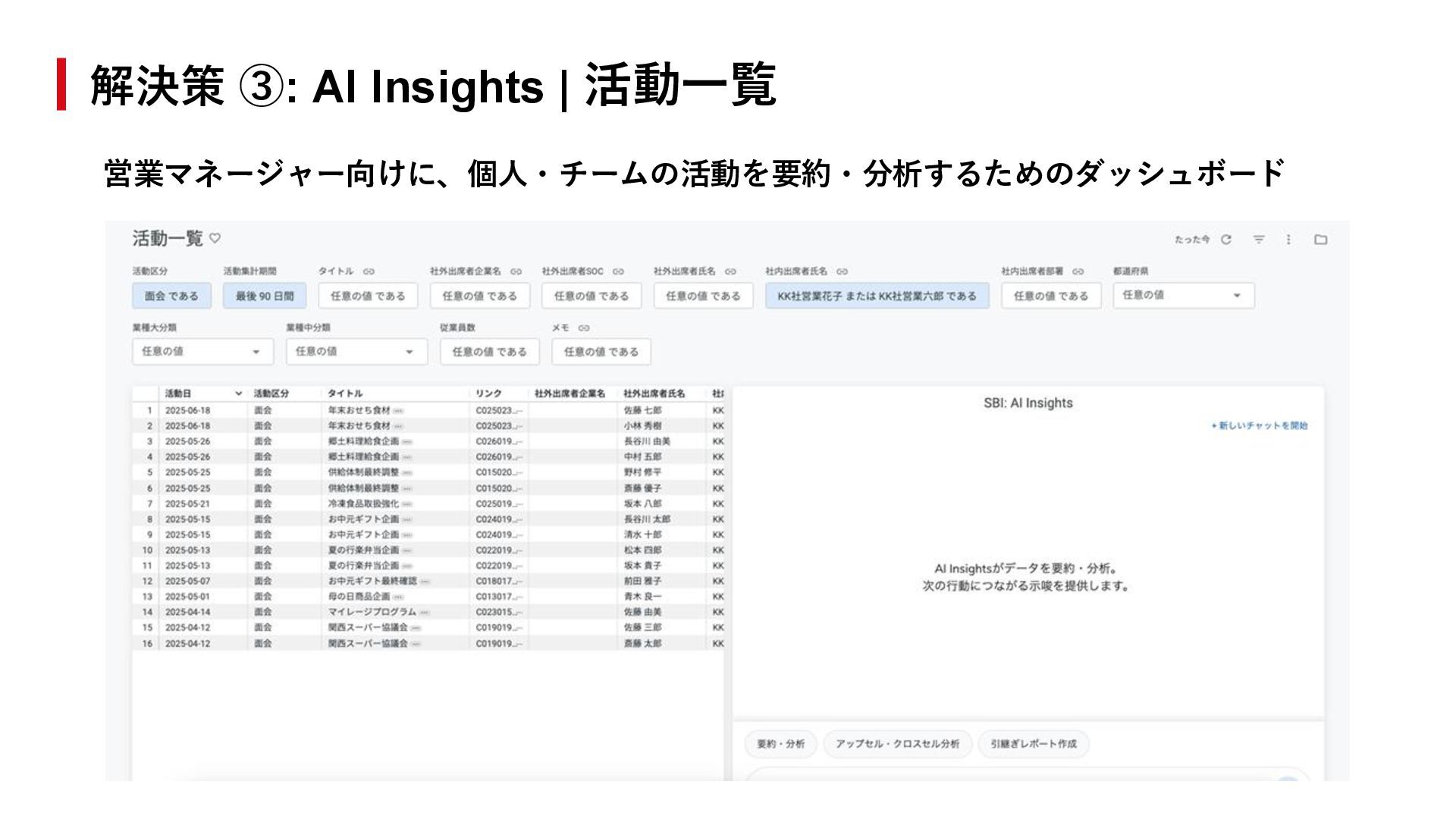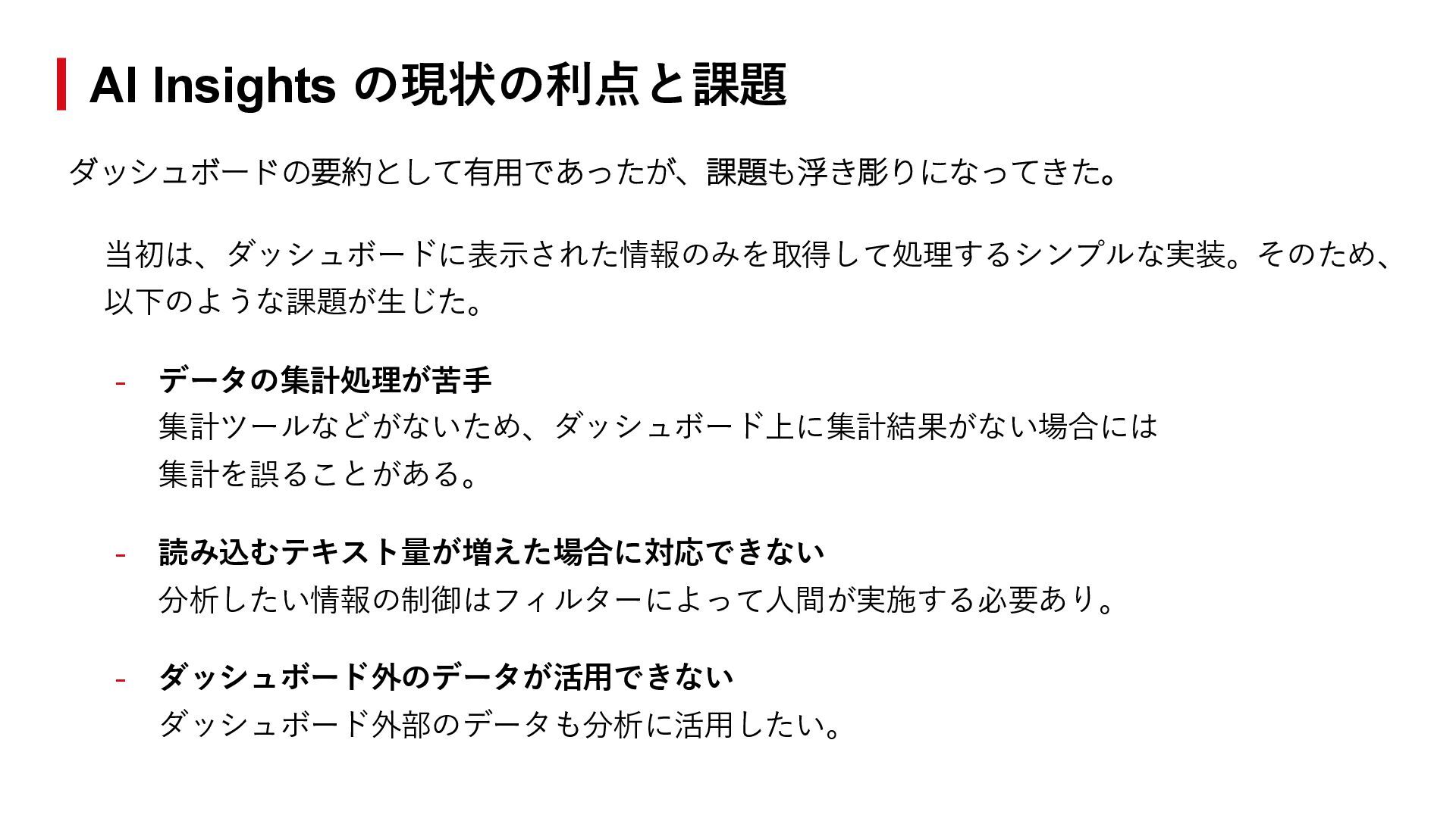 解決策 ③「AI Insights」を発展させ、 ダッシュボードでの分析体験をベースにしつつ、 ダッシュボードにとどまらず、AI自体が自律的に分析・ 示唆出しを実施 = AI on BI から AI with BI への進化 伴走型の導入支援 解決策 ②「セミオーダー方式」の実現のための • ビジネス・開発が一体となったサポート体制 • 段階的な導入プロセス • 継続的な改善の仕組み