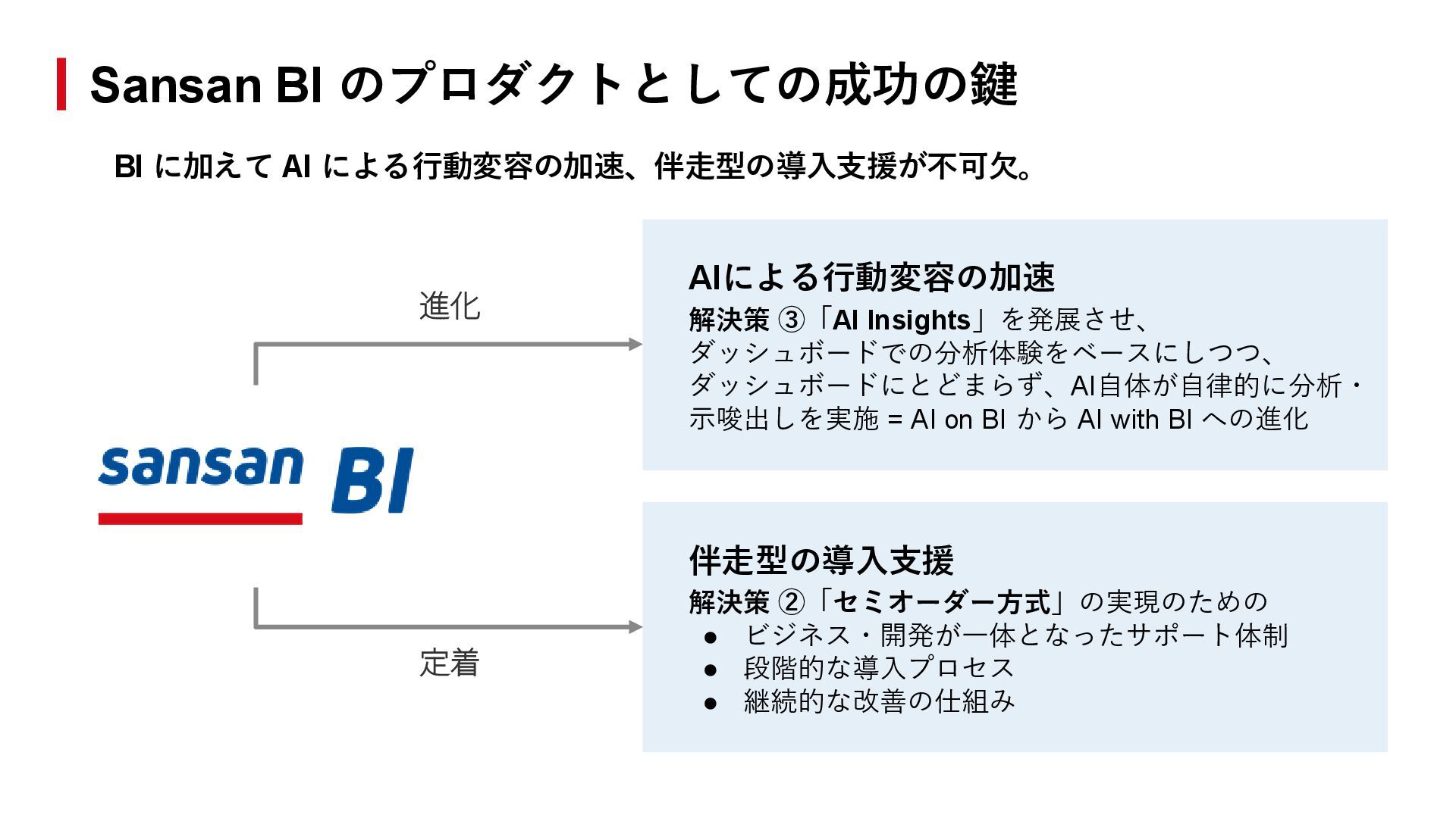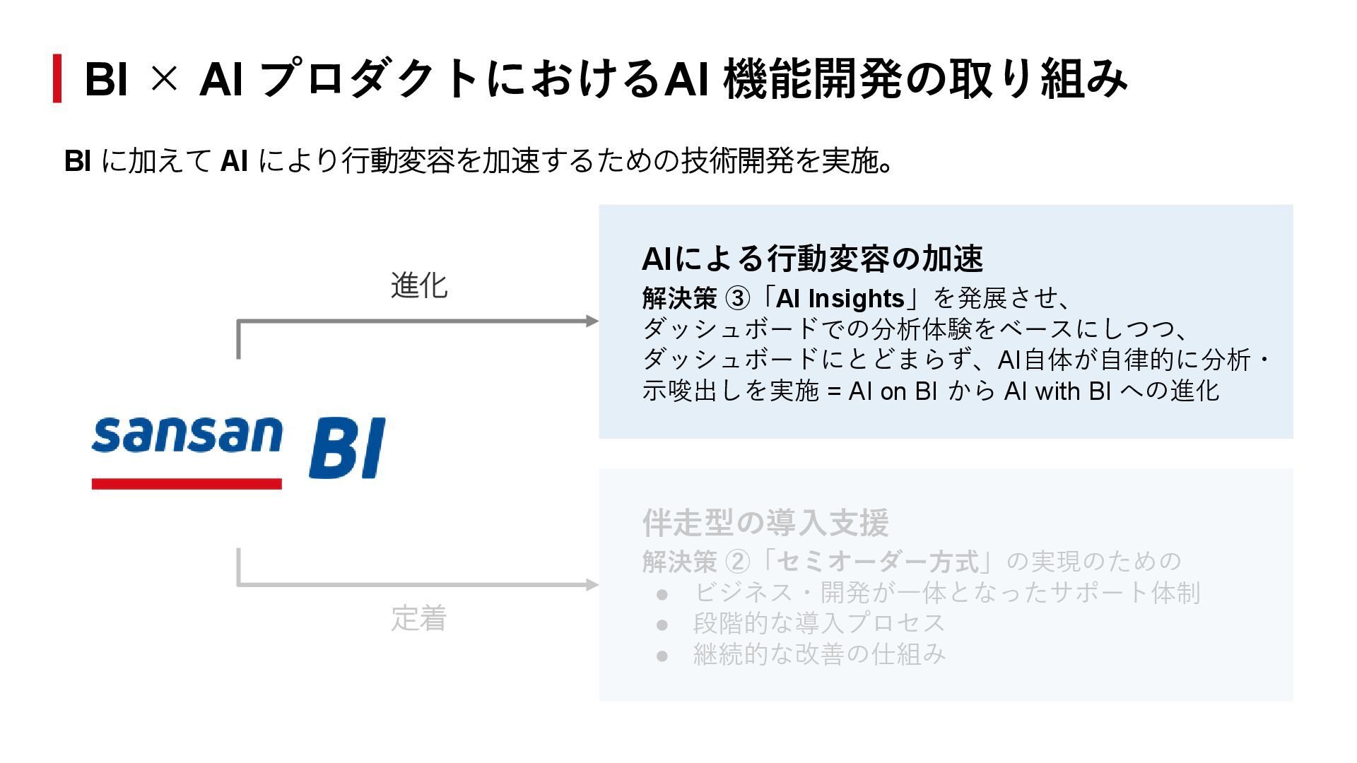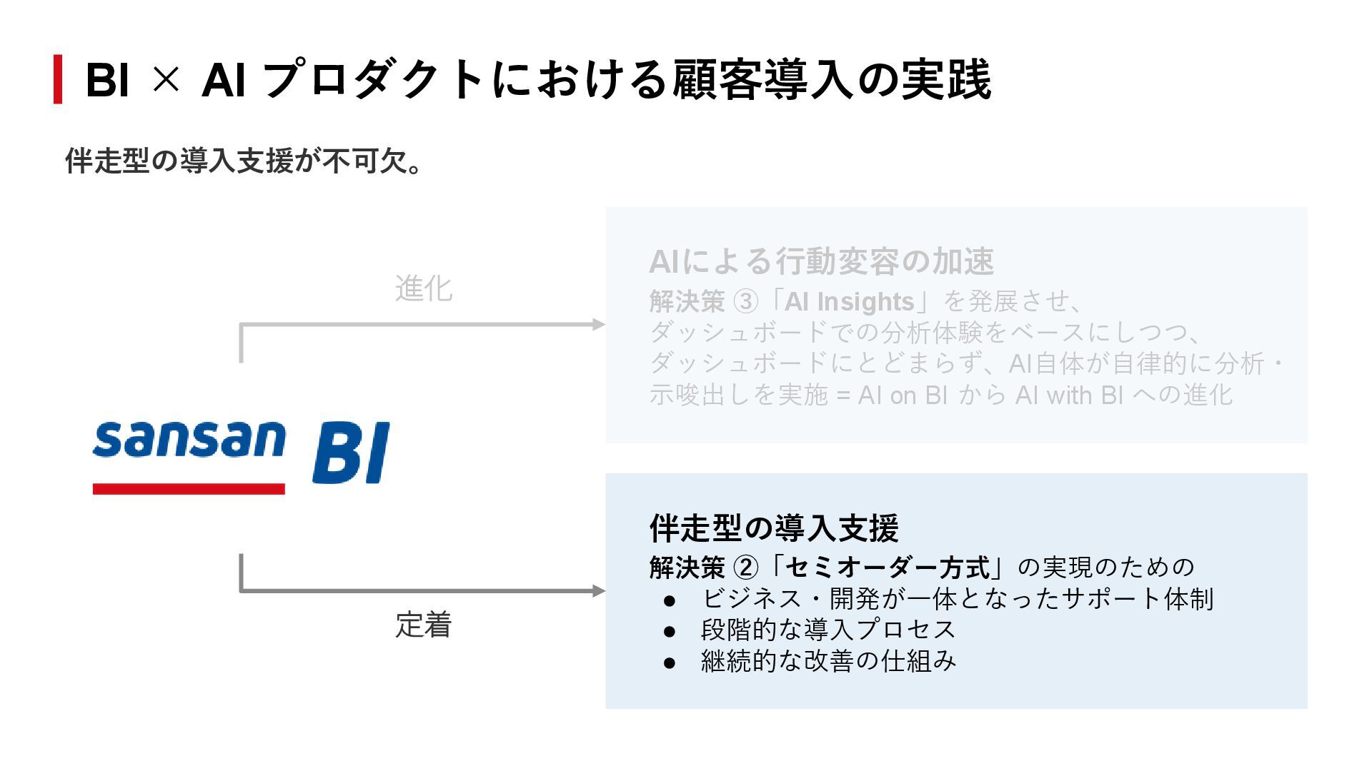定着 AIによる行動変容の加速 解決策 ③「AI Insights」を発展させ、 ダッシュボードでの分析体験をベースにしつつ、 ダッシュボードにとどまらず、AI自体が自律的に分析・ 示唆出しを実施 = AI on BI から AI with BI への進化 伴走型の導入支援 解決策 ②「セミオーダー方式」の実現のための • ビジネス・開発が一体となったサポート体制 • 段階的な導入プロセス • 継続的な改善の仕組み