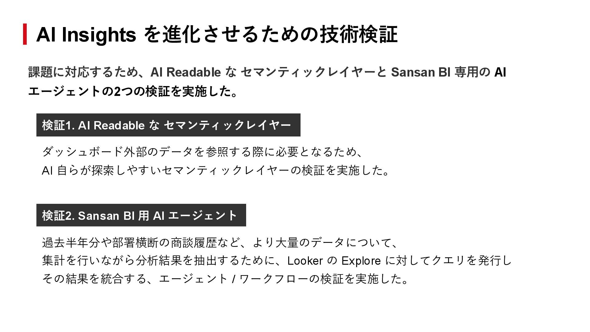 BI 用 AI エージェント 過去半年分や部署横断の商談履歴など、より大量のデータについて、 集計を行いながら分析結果を抽出するために、Looker の Explore に対してクエリを発行し その結果を統合する、エージェント / ワークフローの検証を実施した。 AI Insights を進化させるための技術検証 課題に対応するため、AI Readable な セマンティックレイヤーと Sansan BI 専用の AI エージェントの2つの検証を実施した。