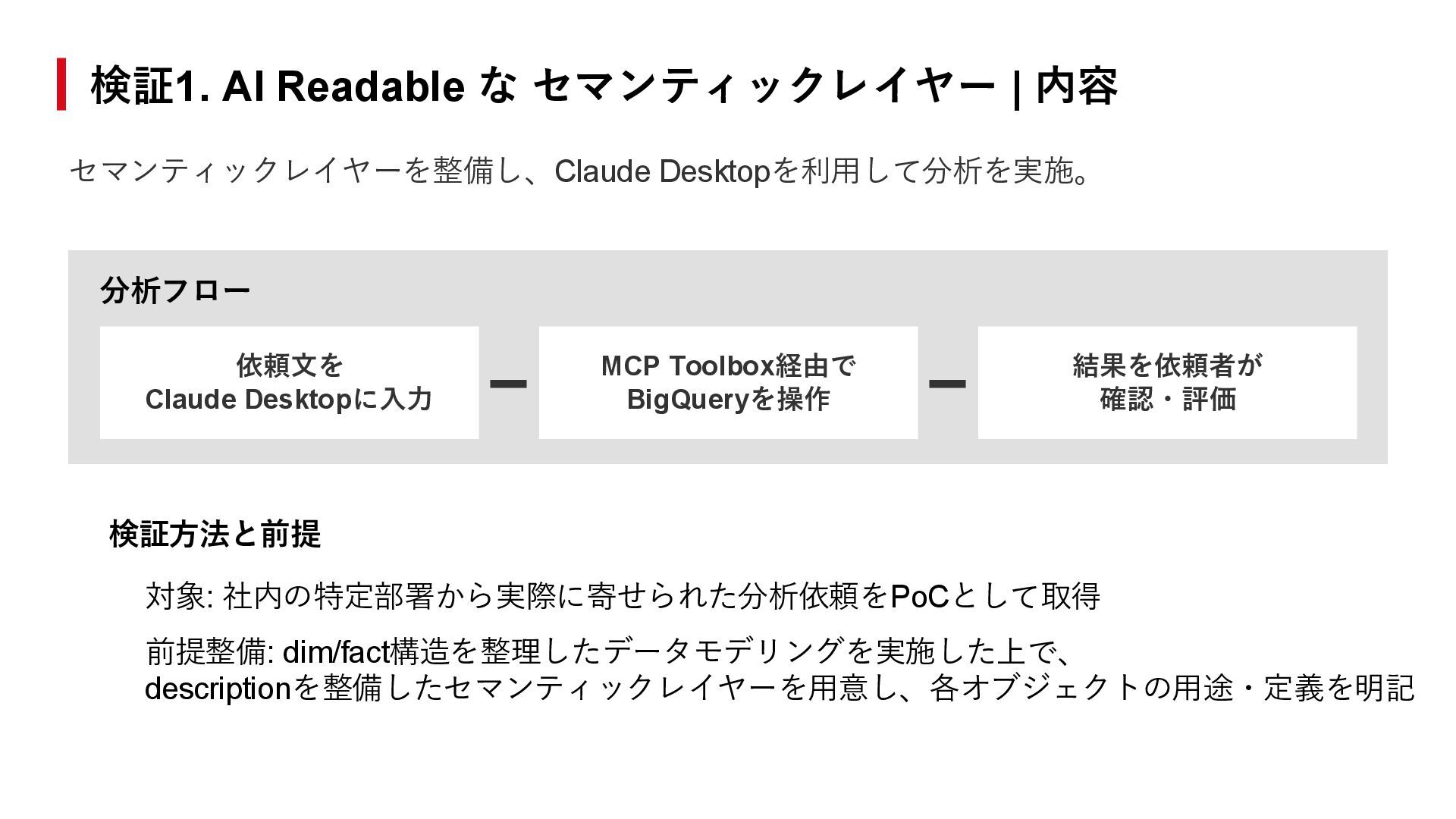 Desktopに入力 MCP Toolbox経由で BigQueryを操作 結果を依頼者が 確認・評価 検証方法と前提 対象: 社内の特定部署から実際に寄せられた分析依頼をPoCとして取得 前提整備: dim/fact構造を整理したデータモデリングを実施した上で、 descriptionを整備したセマンティックレイヤーを用意し、各オブジェクトの用途・定義を明記 セマンティックレイヤーを整備し、Claude Desktopを利用して分析を実施。