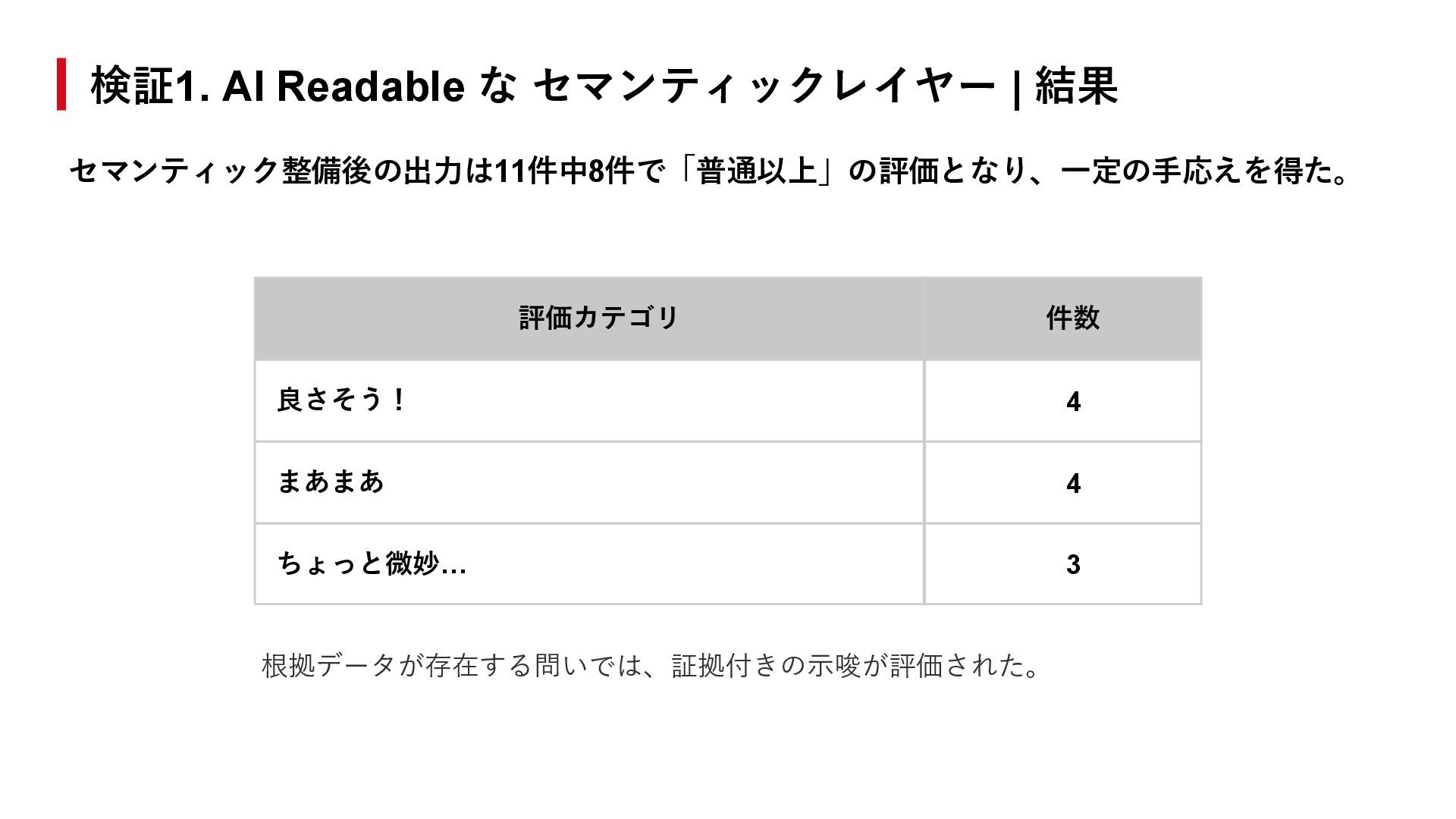 - 構造化されたデータに対して、AIエージェントが柔軟にクエリを実行できる。 - 簡単な分析では、人間と同様の分析が可能。 - 同じ依頼でも回答が揺れる。曖昧な依頼の場合さらに揺れやすい。 - 似た構造のテーブルを誤参照するケースが散見された。 - データとして存在しない前提を含む依頼に対し、無理やり回答をしてしまう。