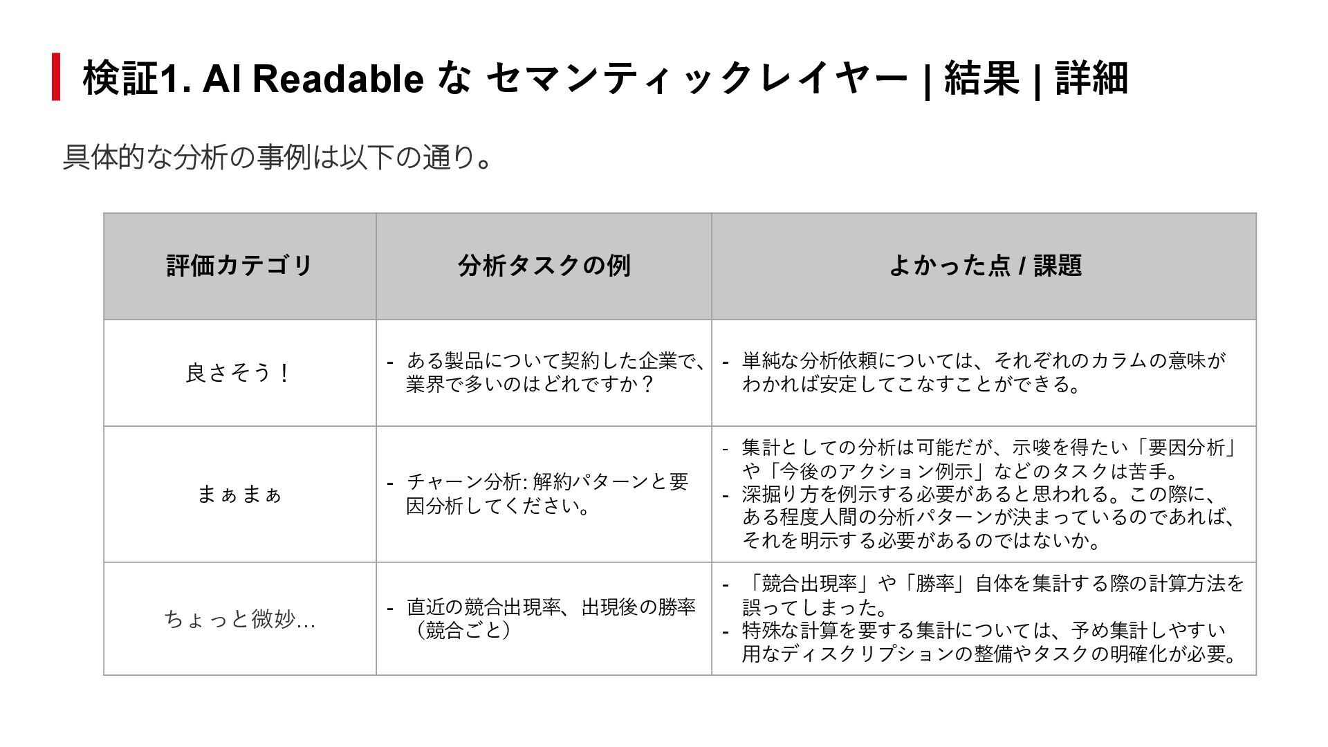 16. 検証1. AI Readable な セマンティックレイヤー | 結果 | 詳細 具体的な分析の事例は以下の通り。