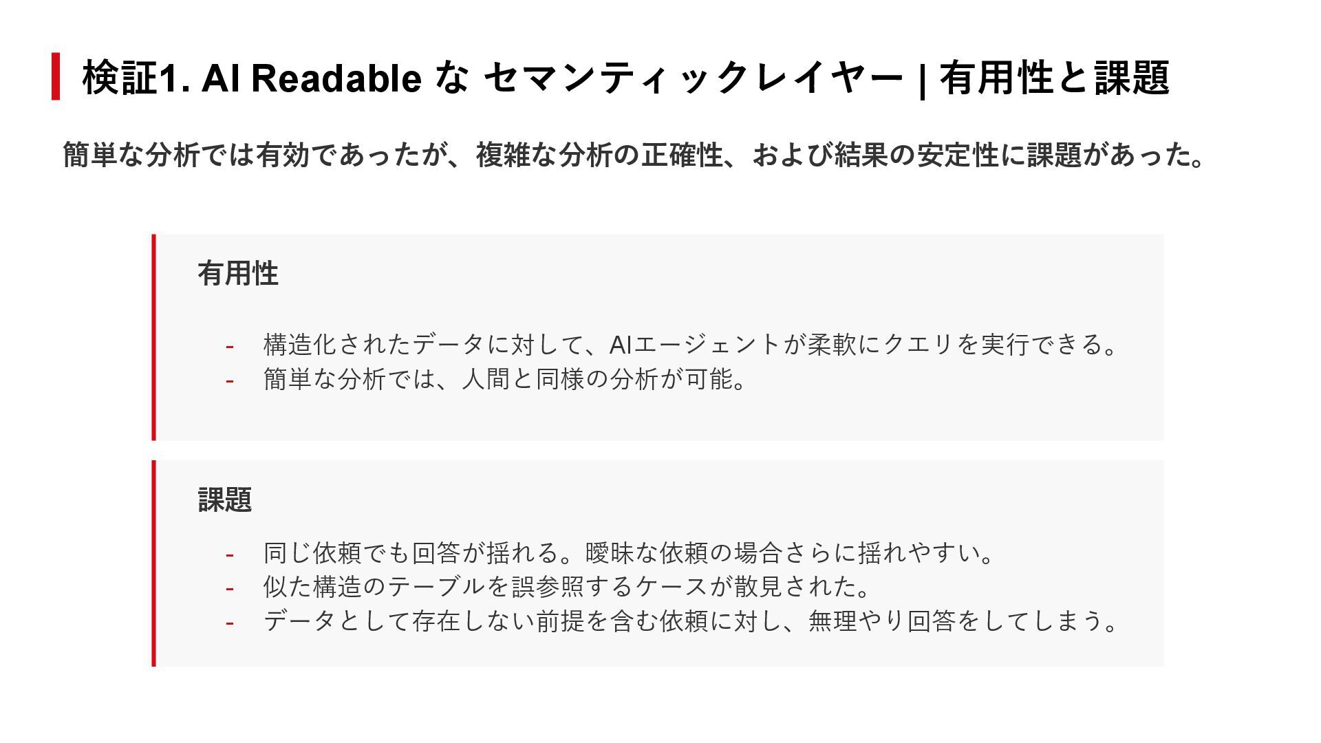 17. 検証1. AI Readable な セマンティックレイヤー | 有用性と課題 簡単な分析では有効であったが、複雑な分析の正確性、および結果の安定性に課題があった。 有用性 課題