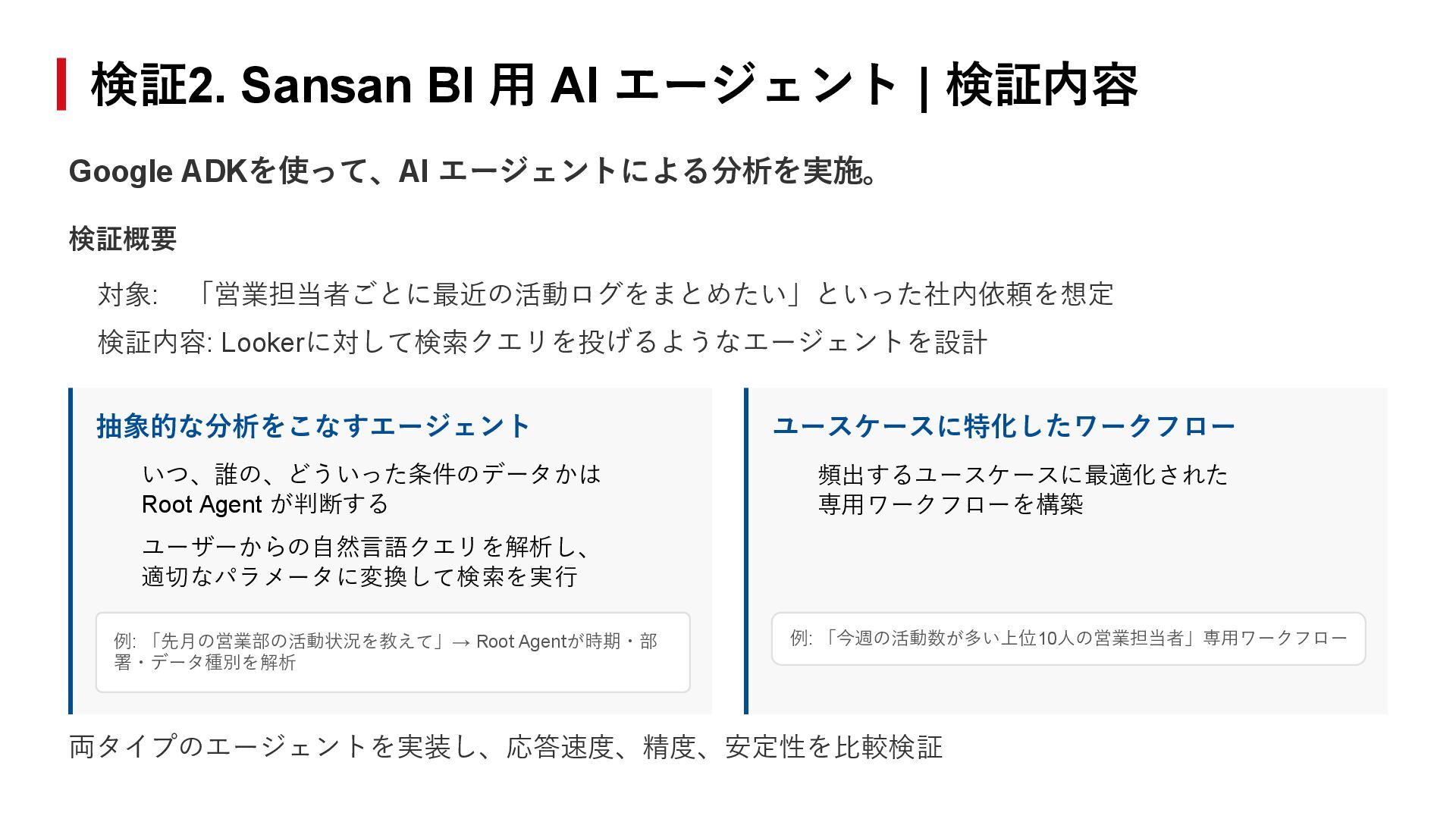 が判断する ユーザーからの自然言語クエリを解析し、 適切なパラメータに変換して検索を実行 頻出するユースケースに最適化された 専用ワークフローを構築 例: 「先月の営業部の活動状況を教えて」→ Root Agentが時期・部 署・データ種別を解析 例: 「今週の活動数が多い上位10人の営業担当者」専用ワークフロー 両タイプのエージェントを実装し、応答速度、精度、安定性を比較検証 Google ADKを使って、AI エージェントによる分析を実施。 検証2. Sansan BI 用 AI エージェント | 検証内容