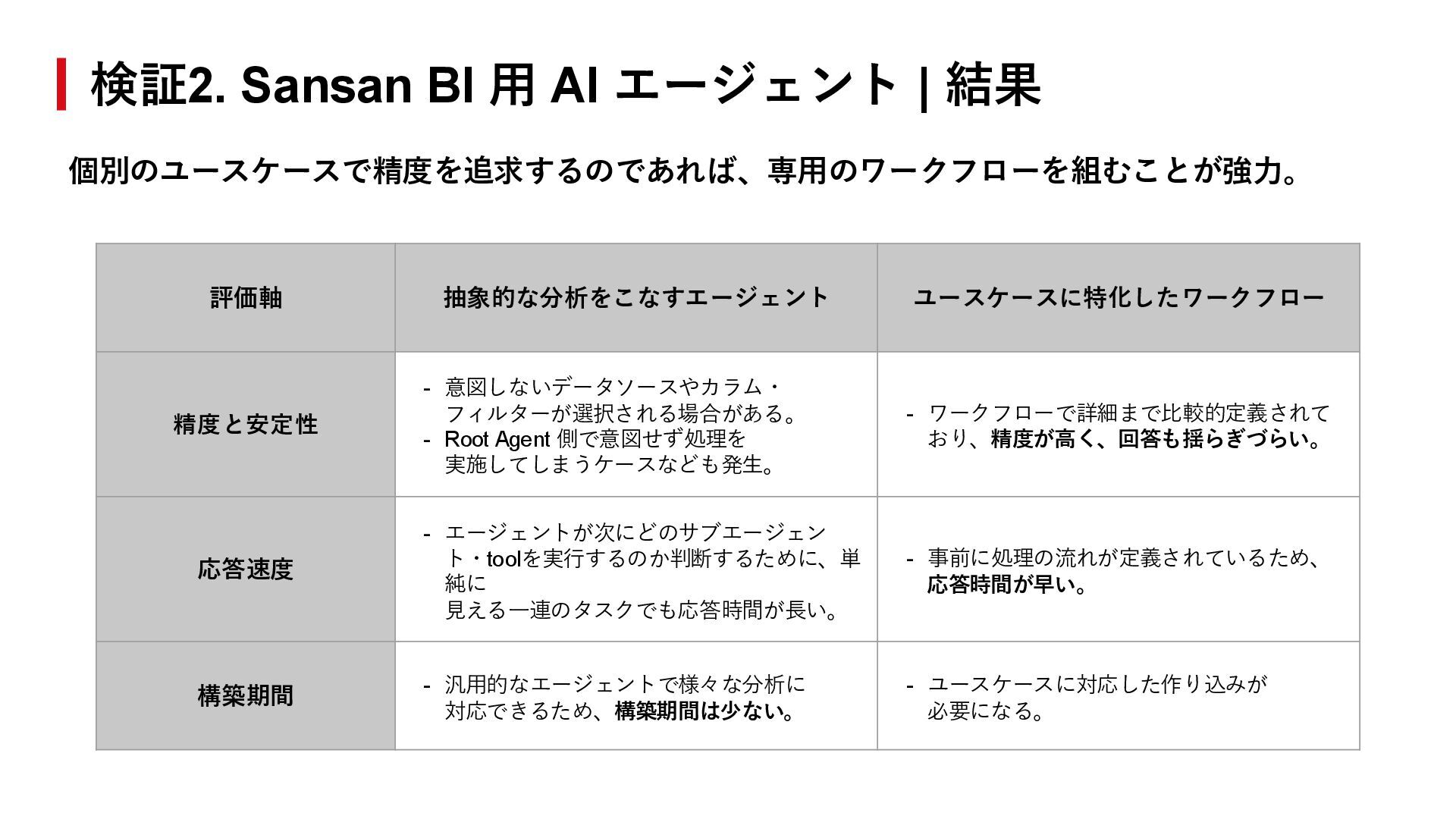 抽象的な分析をこなすエージェント ユースケースに特化したワークフロー 精度と安定性 - 意図しないデータソースやカラム・ フィルターが選択される場合がある。 - Root Agent 側で意図せず処理を 実施してしまうケースなども発生。 - ワークフローで詳細まで比較的定義されて おり、精度が高く、回答も揺らぎづらい。 応答速度 - エージェントが次にどのサブエージェン ト・toolを実行するのか判断するために、単 純に 見える一連のタスクでも応答時間が長い。 - 事前に処理の流れが定義されているため、 応答時間が早い。 構築期間 - 汎用的なエージェントで様々な分析に 対応できるため、構築期間は少ない。 - ユースケースに対応した作り込みが 必要になる。