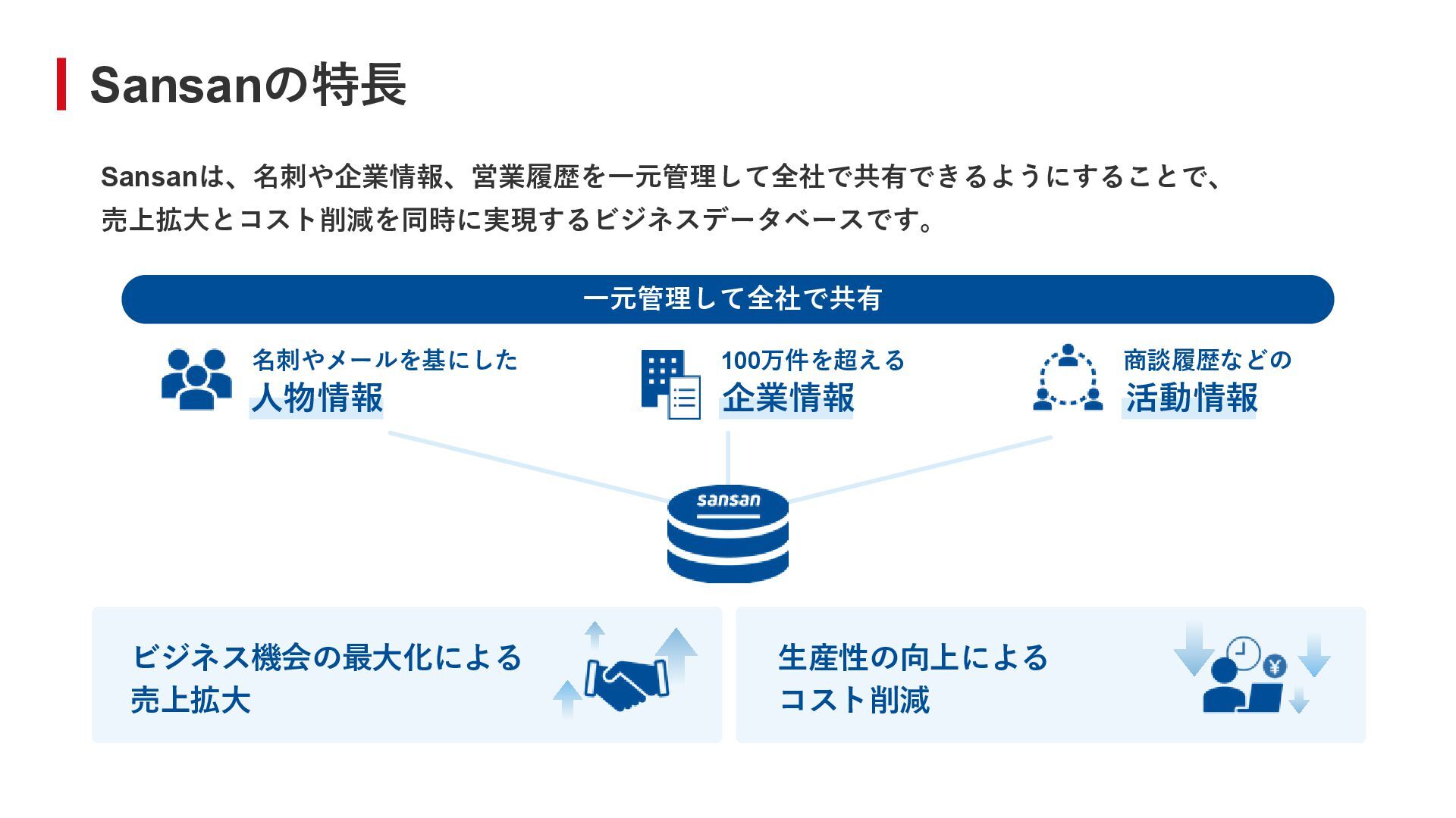 活動情報 人物情報 Sansanは、名刺や企業情報、営業履歴を一元管理して全社で共有できるようにすることで、 売上拡大とコスト削減を同時に実現するビジネスデータベースです。