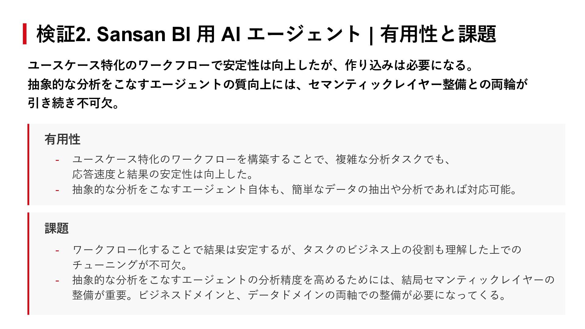 - ワークフロー化することで結果は安定するが、タスクのビジネス上の役割も理解した上での チューニングが不可欠。 - 抽象的な分析をこなすエージェントの分析精度を高めるためには、結局セマンティックレイヤーの 整備が重要。ビジネスドメインと、データドメインの両軸での整備が必要になってくる。 検証2. Sansan BI 用 AI エージェント | 有用性と課題