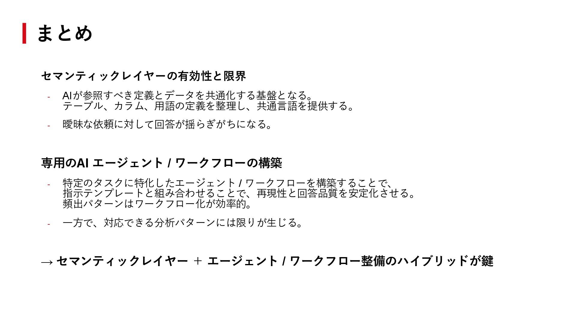 - 特定のタスクに特化したエージェント / ワークフローを構築することで、 指示テンプレートと組み合わせることで、再現性と回答品質を安定化させる。 頻出パターンはワークフロー化が効率的。 - 一方で、対応できる分析パターンには限りが生じる。 → セマンティックレイヤー + エージェント / ワークフロー整備のハイブリッドが鍵 まとめ