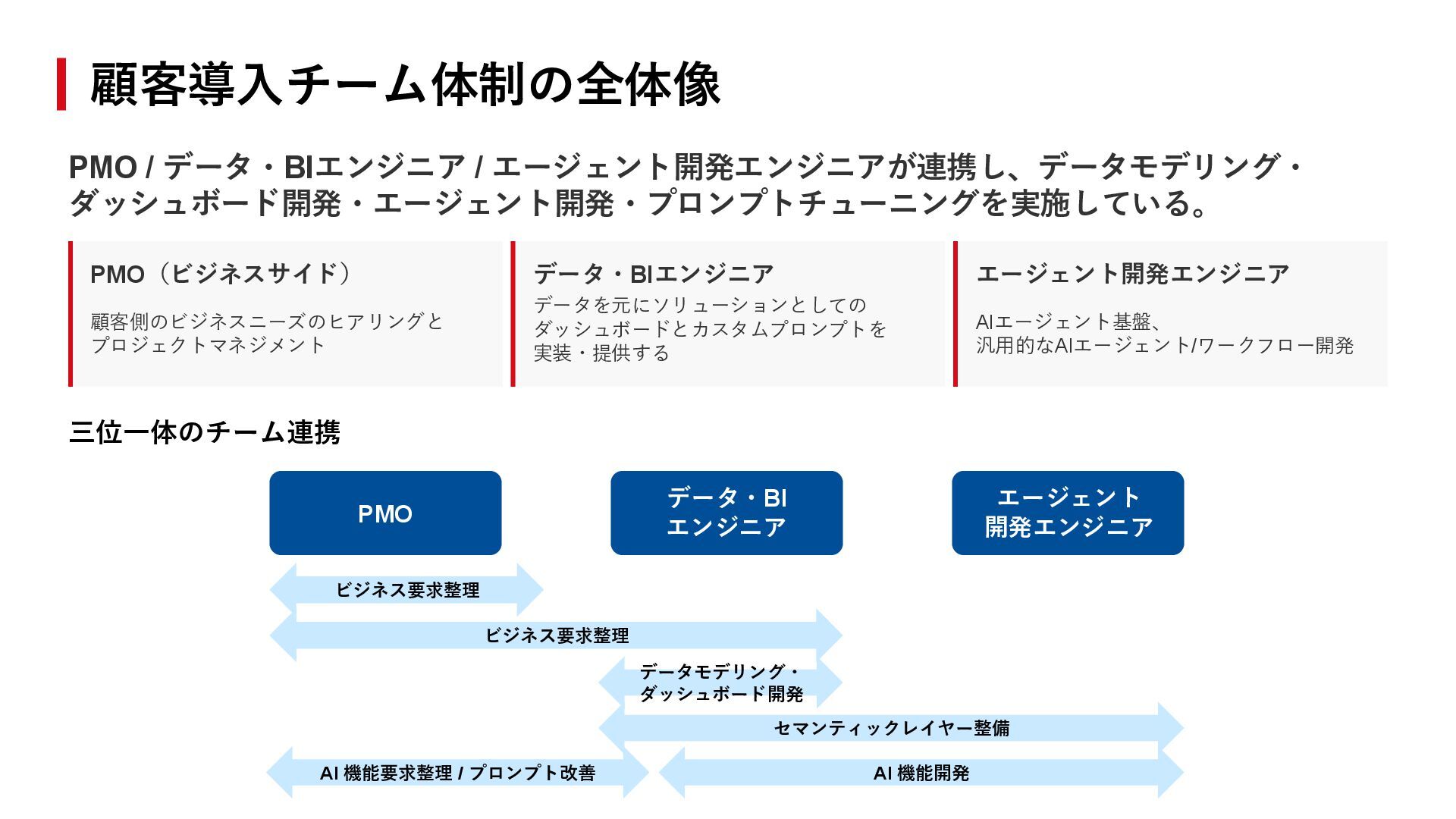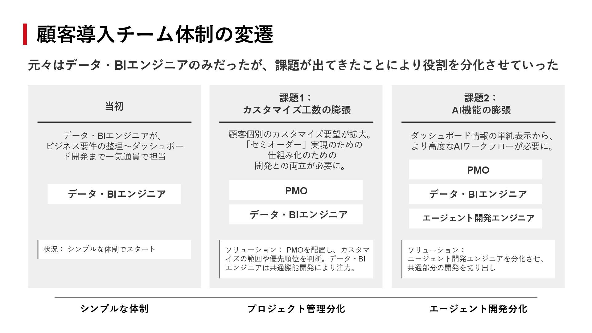 顧客個別のカスタマイズ要望が拡大。 「セミオーダー」実現のための 仕組み化のための 開発との両立が必要に。 ダッシュボード情報の単純表示から、 より高度なAIワークフローが必要に。 データ・BIエンジニア PMO データ・BIエンジニア PMO データ・BIエンジニア エージェント開発エンジニア 状況: シンプルな体制でスタート ソリューション: PMOを配置し、カスタマ イズの範囲や優先順位を判断。データ・BI エンジニアは共通機能開発により注力。 シンプルな体制 プロジェクト管理分化 エージェント開発分化 ソリューション: エージェント開発エンジニアを分化させ、 共通部分の開発を切り出し