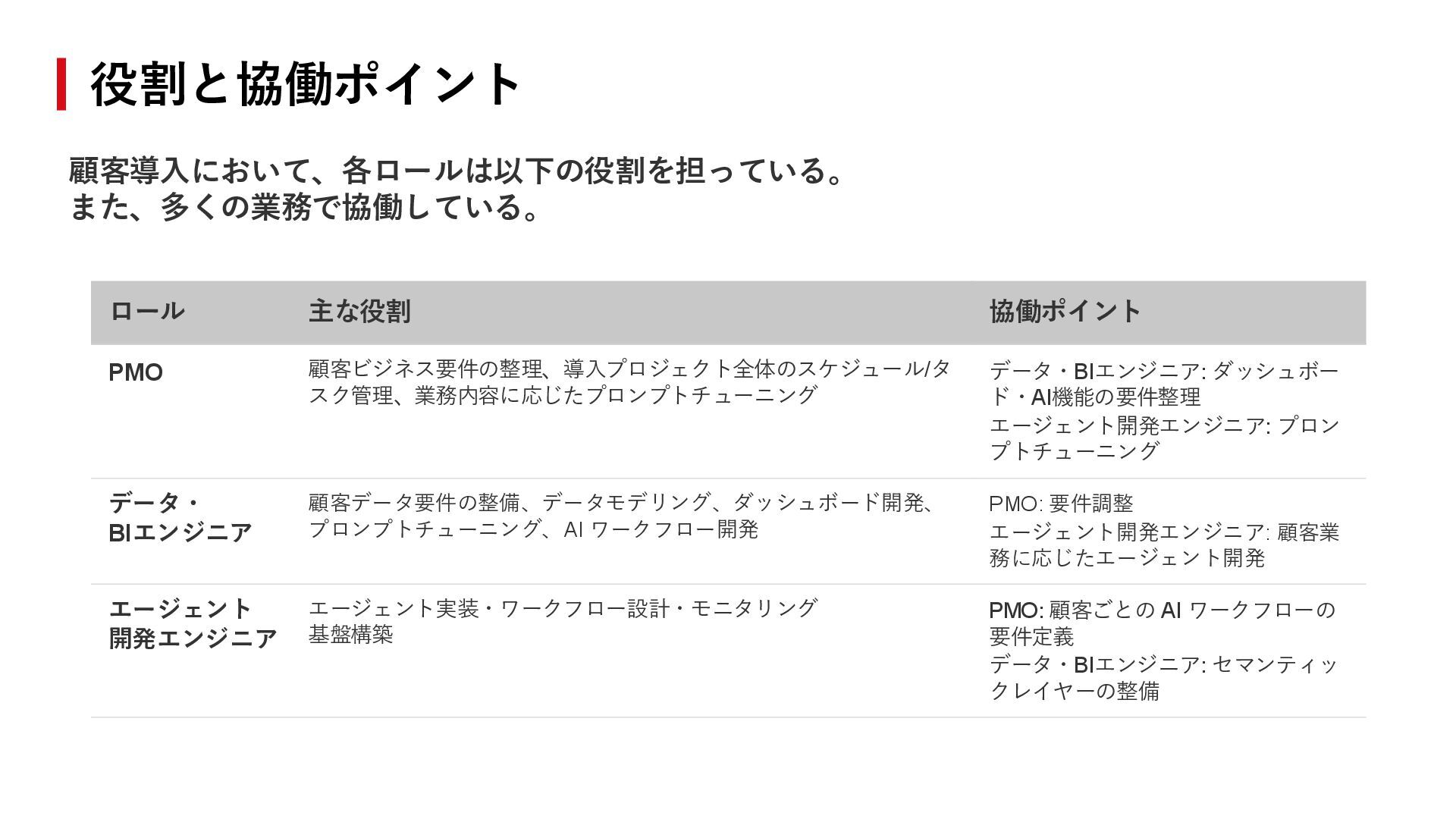 24. 顧客導入において、各ロールは以下の役割を担っている。 また、多くの業務で協働している。 役割と協働ポイント ロール 主な役割 協働ポイント PMO 顧客ビジネス要件の整理、導入プロジェクト全体のスケジュール/タ スク管理、業務内容に応じたプロンプトチューニング データ・BIエンジニア: