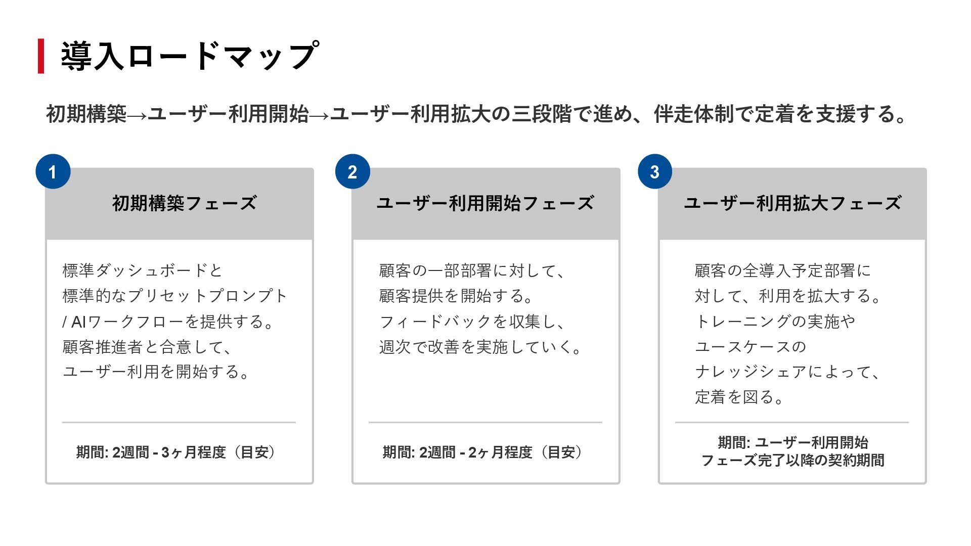 顧客の一部部署に対して、 顧客提供を開始する。 フィードバックを収集し、 週次で改善を実施していく。 顧客の全導入予定部署に 対して、利用を拡大する。 トレーニングの実施や ユースケースの ナレッジシェアによって、 定着を図る。 期間: 2週間 - 3ヶ月程度(目安) 期間: 2週間 - 2ヶ月程度(目安) 期間: ユーザー利用開始 フェーズ完了以降の契約期間 導入ロードマップ 1 2 3