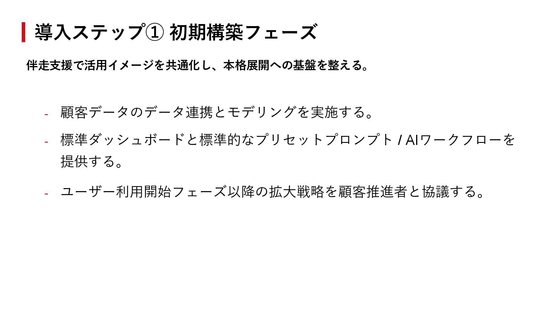 26. 初期構築→ユーザー利用開始→ユーザー利用拡大の三段階で進め、伴走体制で定着を支援する。 初期構築フェーズ ユーザー利用開始フェーズ ユーザー利用拡大フェーズ 標準ダッシュボードと 標準的なプリセットプロンプト / AIワークフローを提供する。 顧客推進者と合意して、 ユーザー利用を開始する。