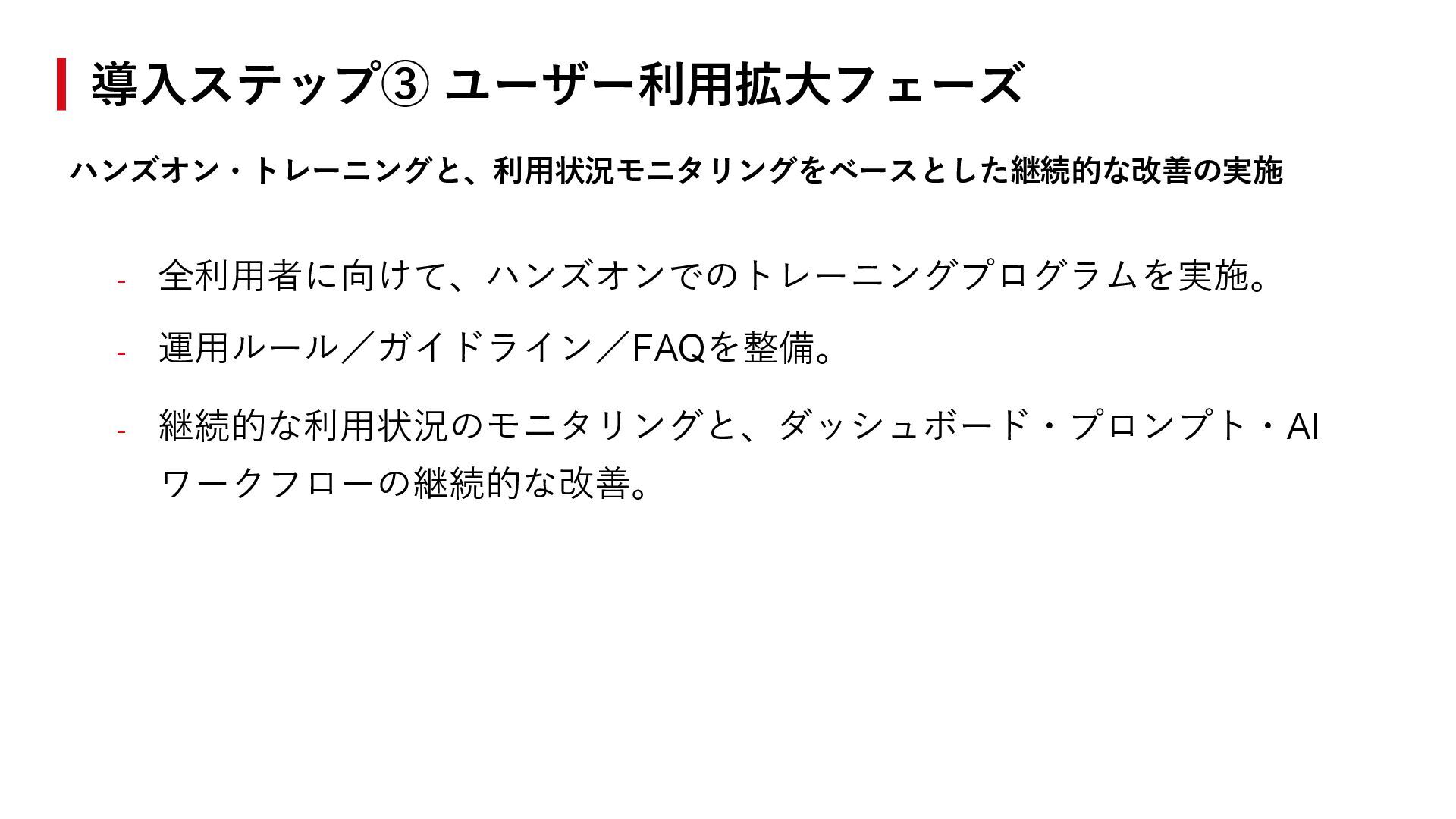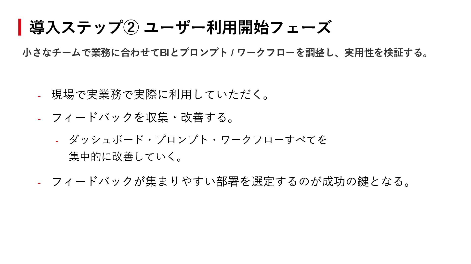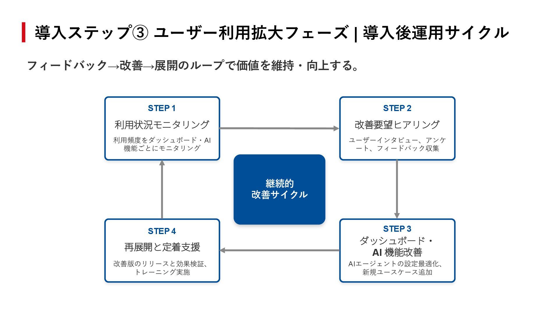 3 STEP 4 利用状況モニタリング 改善要望ヒアリング ダッシュボード・ AI 機能改善 再展開と定着支援 利用頻度をダッシュボード・AI 機能ごとにモニタリング AIエージェントの設定最適化、 新規ユースケース追加 ユーザーインタビュー、アンケ ート、フィードバック収集 改善版のリリースと効果検証、 トレーニング実施 継続的 改善サイクル