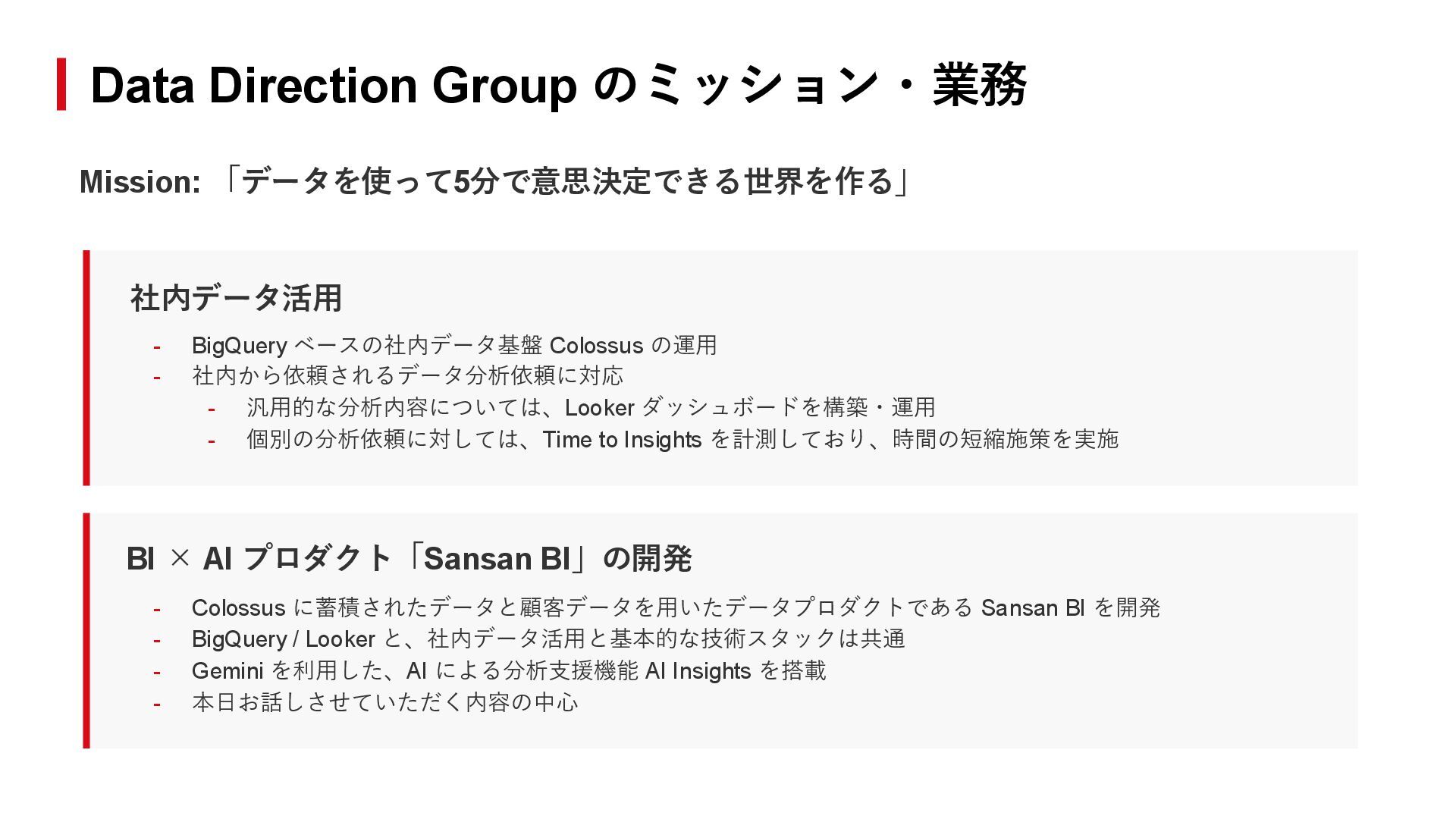 BI」の開発 - Colossus に蓄積されたデータと顧客データを用いたデータプロダクトである Sansan BI を開発 - BigQuery / Looker と、社内データ活用と基本的な技術スタックは共通 - Gemini を利用した、AI による分析支援機能 AI Insights を搭載 - 本日お話しさせていただく内容の中心 社内データ活用 - BigQuery ベースの社内データ基盤 Colossus の運用 - 社内から依頼されるデータ分析依頼に対応 - 汎用的な分析内容については、Looker ダッシュボードを構築・運用 - 個別の分析依頼に対しては、Time to Insights を計測しており、時間の短縮施策を実施