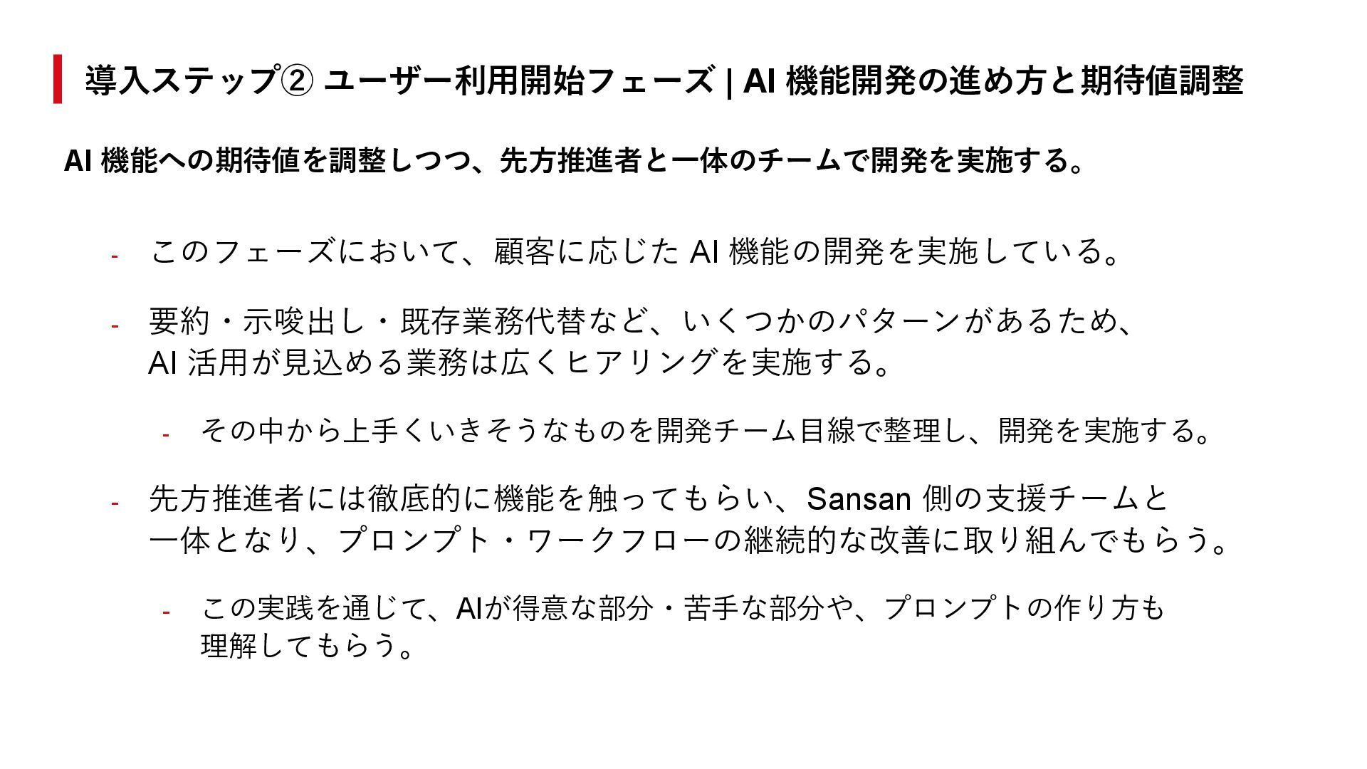 - 先方推進者には徹底的に機能を触ってもらい、Sansan 側の支援チームと 一体となり、プロンプト・ワークフローの継続的な改善に取り組んでもらう。 - この実践を通じて、AIが得意な部分・苦手な部分や、プロンプトの作り方も 理解してもらう。 導入ステップ② ユーザー利用開始フェーズ | AI 機能開発の進め方と期待値調整 AI 機能への期待値を調整しつつ、先方推進者と一体のチームで開発を実施する。
