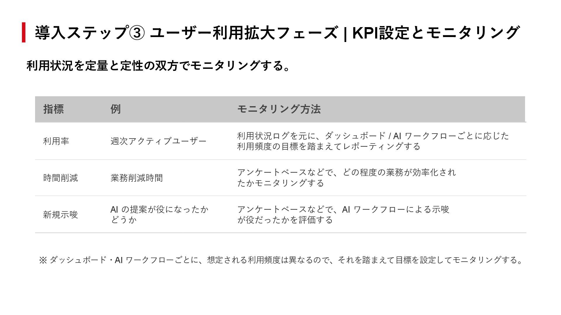 利用状況ログを元に、ダッシュボード / AI ワークフローごとに応じた 利用頻度の目標を踏まえてレポーティングする 時間削減 業務削減時間 アンケートベースなどで、どの程度の業務が効率化され たかモニタリングする 新規示唆 AI の提案が役になったか どうか アンケートベースなどで、AI ワークフローによる示唆 が役だったかを評価する ※ ダッシュボード・AI ワークフローごとに、想定される利用頻度は異なるので、それを踏まえて目標を設定してモニタリングする。