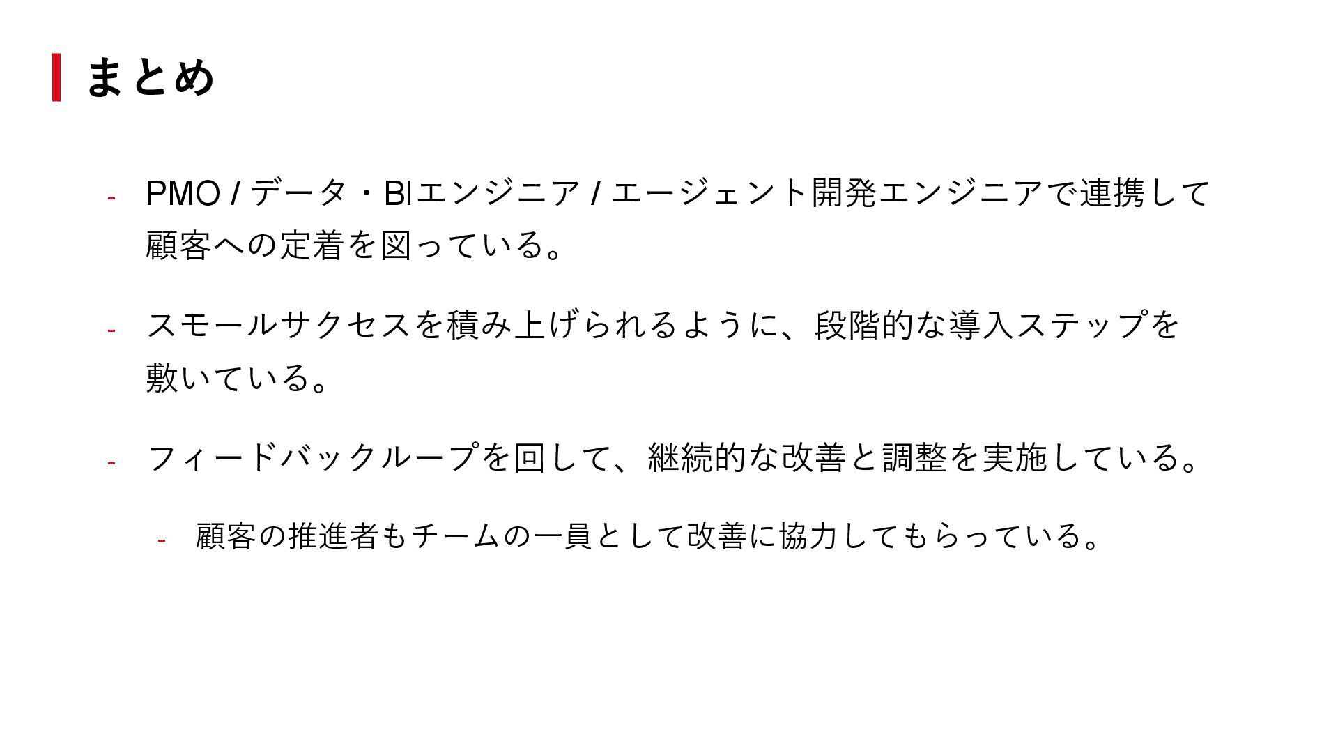 - フィードバックループを回して、継続的な改善と調整を実施している。 - 顧客の推進者もチームの一員として改善に協力してもらっている。 まとめ