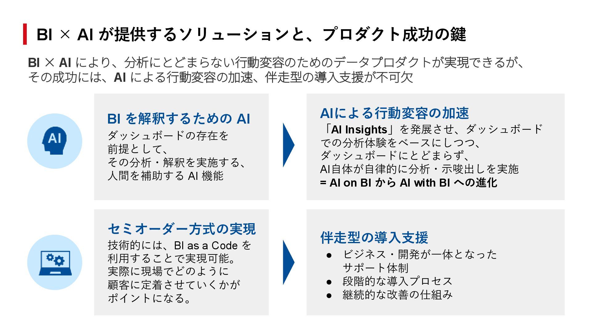 × AI が提供するソリューションと、プロダクト成功の鍵 BI × AI により、分析にとどまらない行動変容のためのデータプロダクトが実現できるが、 その成功には、AI による行動変容の加速、伴走型の導入支援が不可欠 AIによる行動変容の加速 「AI Insights」を発展させ、ダッシュボード での分析体験をベースにしつつ、 ダッシュボードにとどまらず、 AI自体が自律的に分析・示唆出しを実施 = AI on BI から AI with BI への進化 伴走型の導入支援 • ビジネス・開発が一体となった サポート体制 • 段階的な導入プロセス • 継続的な改善の仕組み セミオーダー方式の実現 技術的には、BI as a Code を 利用することで実現可能。 実際に現場でどのように 顧客に定着させていくかが ポイントになる。
