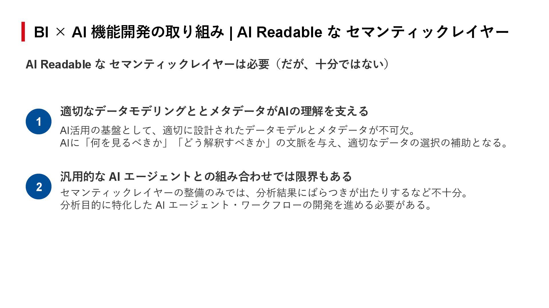 21. セマンティックレイヤーの有効性と限界 - AIが参照すべき定義とデータを共通化する基盤となる。 テーブル、カラム、用語の定義を整理し、共通言語を提供する。 - 曖昧な依頼に対して回答が揺らぎがちになる。 専用のAI エージェント / ワークフローの構築