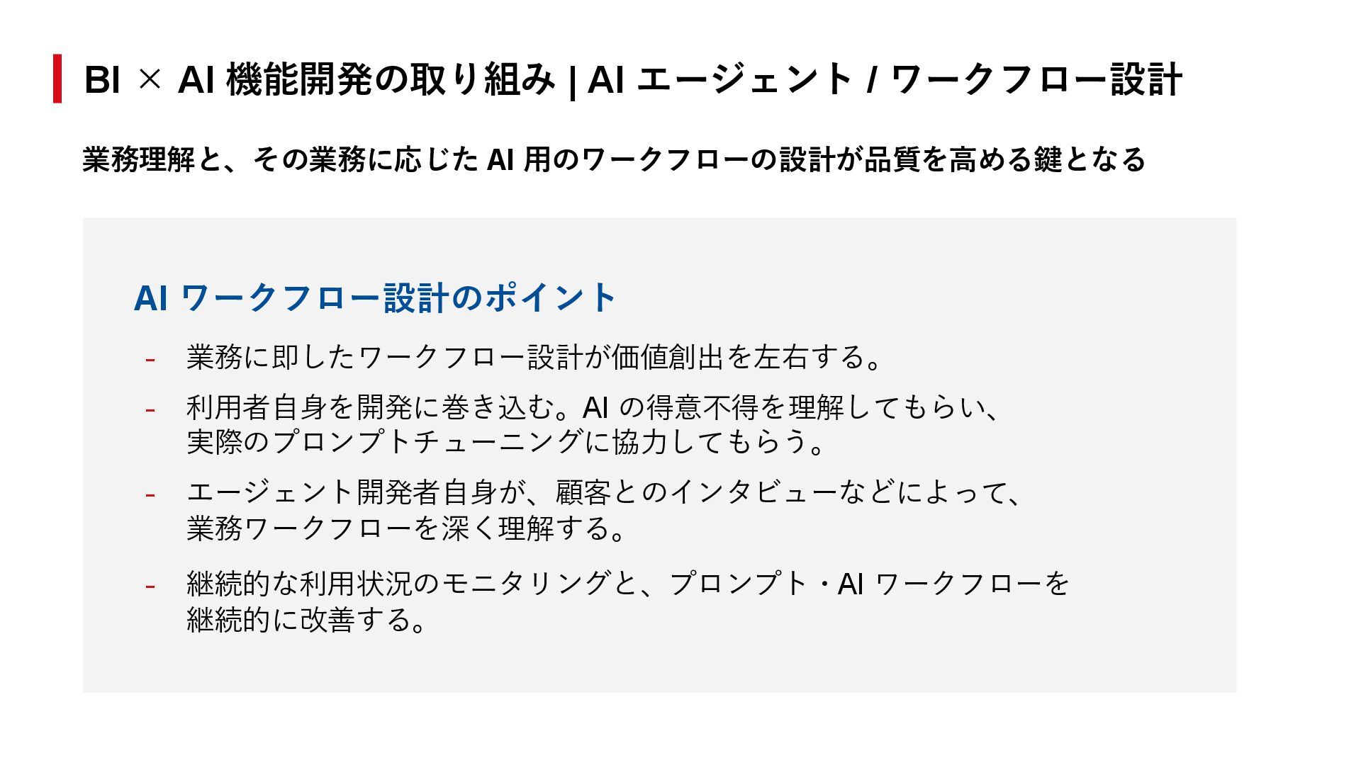 業務ワークフローを深く理解する。 - 継続的な利用状況のモニタリングと、プロンプト・AI ワークフローを 継続的に改善する。 BI × AI 機能開発の取り組み | AI エージェント / ワークフロー設計 業務理解と、その業務に応じた AI 用のワークフローの設計が品質を高める鍵となる