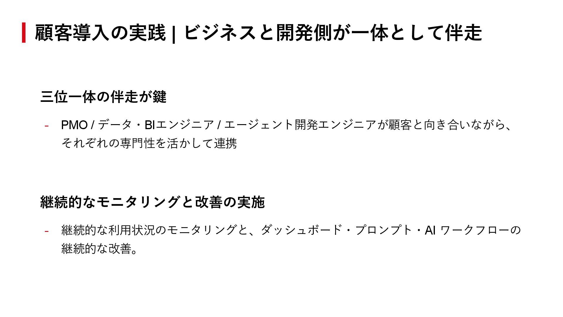 それぞれの専門性を活かして連携 継続的なモニタリングと改善の実施 - 継続的な利用状況のモニタリングと、ダッシュボード・プロンプト・AI ワークフローの 継続的な改善。