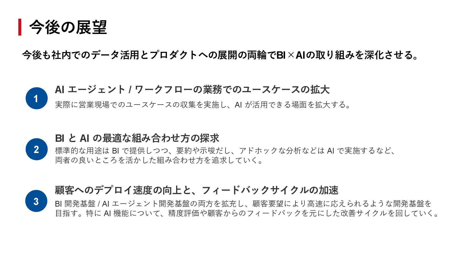 BI と AI の最適な組み合わせ方の探求 標準的な用途は BI で提供しつつ、要約や示唆だし、アドホックな分析などは AI で実施するなど、 両者の良いところを活かした組み合わせ方を追求していく。 3 顧客へのデプロイ速度の向上と、フィードバックサイクルの加速 BI 開発基盤 / AI エージェント開発基盤の両方を拡充し、顧客要望により高速に応えられるような開発基盤を 目指す。特に AI 機能について、精度評価や顧客からのフィードバックを元にした改善サイクルを回していく。